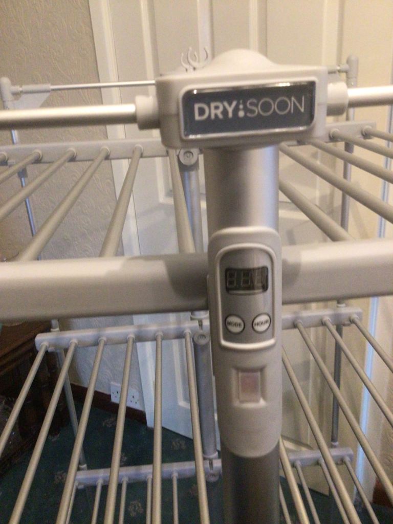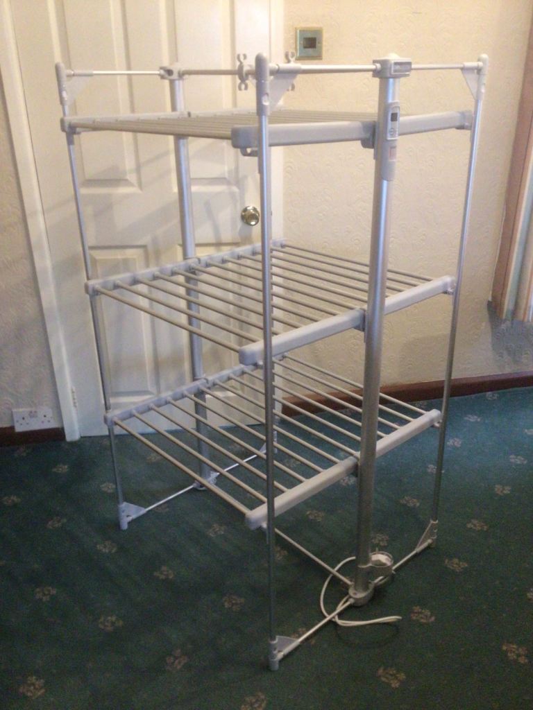 Deluxe heated clothes airer. Holds approx 2 wash loads. Built in timer. Includes airer cover with mesh panels on sides to help air flow.