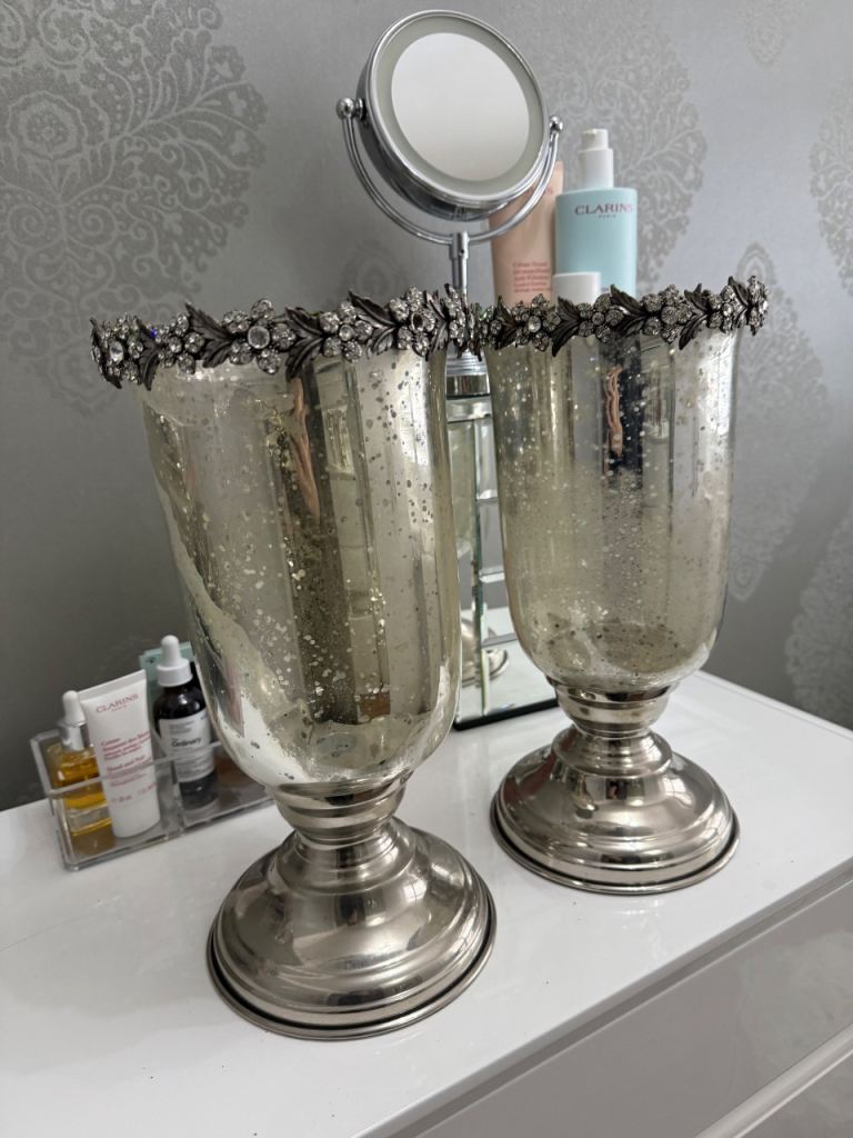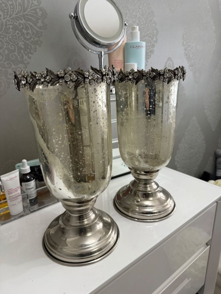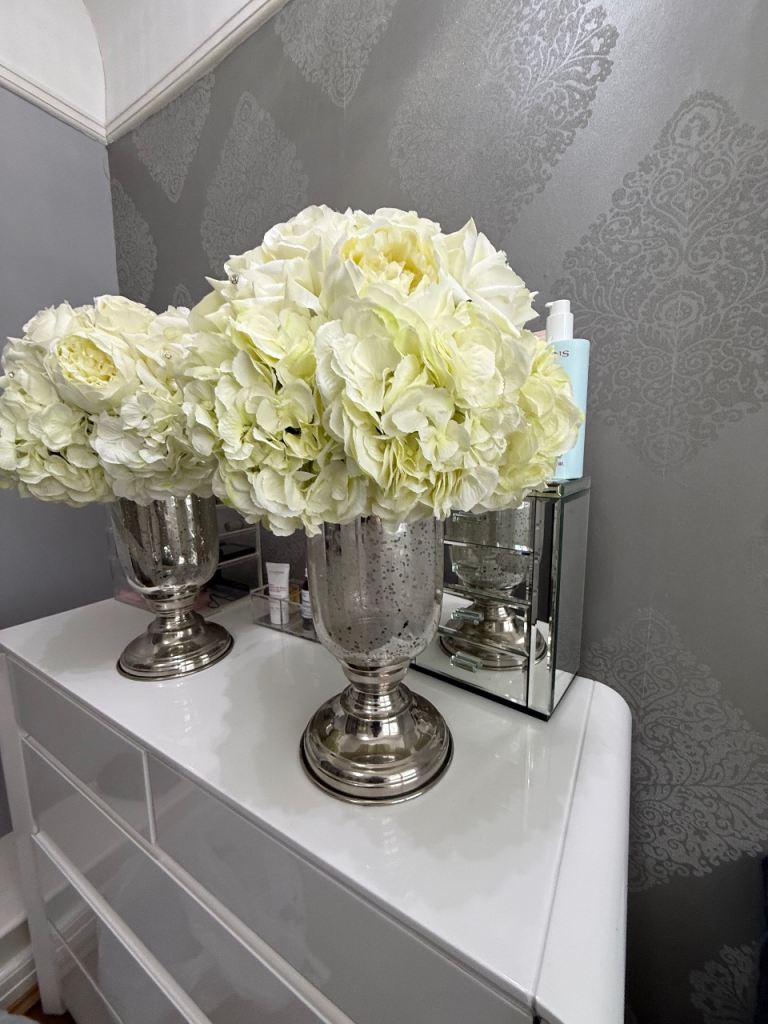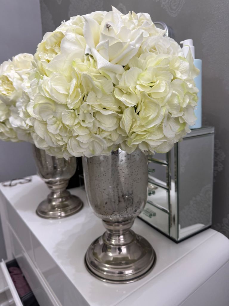 Lovely floral display of lilies and roses in cream colour, with diamonte diamonds all set in a glass fancy vase, the vases were purchased in Taskers, still will price label and i had the flowers custom made to fit the top, the flowers are set to rest on top of vase so can be removed and just use the vases. They are very striking, I have moved them around the house from each side of fireplace to the kitchen island and on the dining table they always looked amazing. They are tall, standing at 20inch high. Collection only from Litherland.