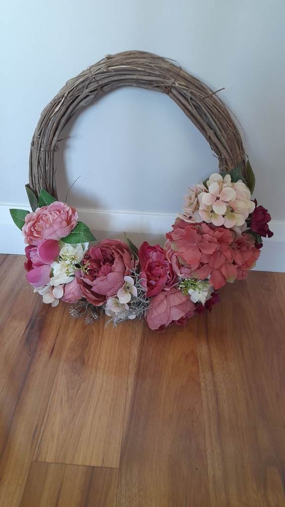 Floral decorative door wreath, various tones of pink