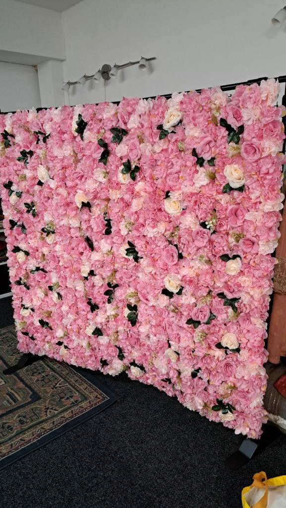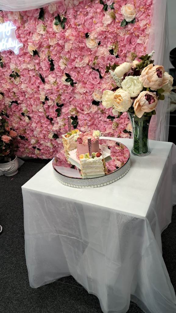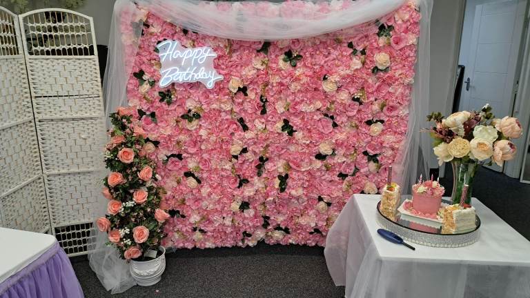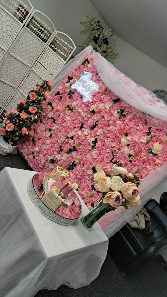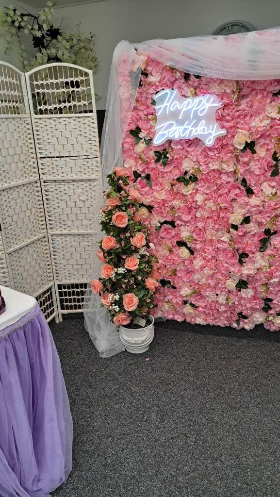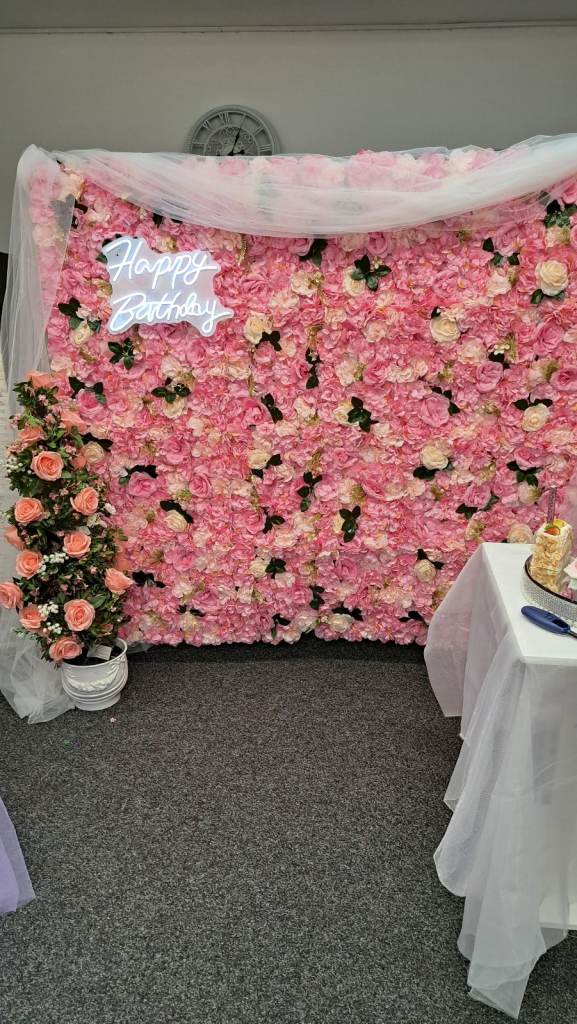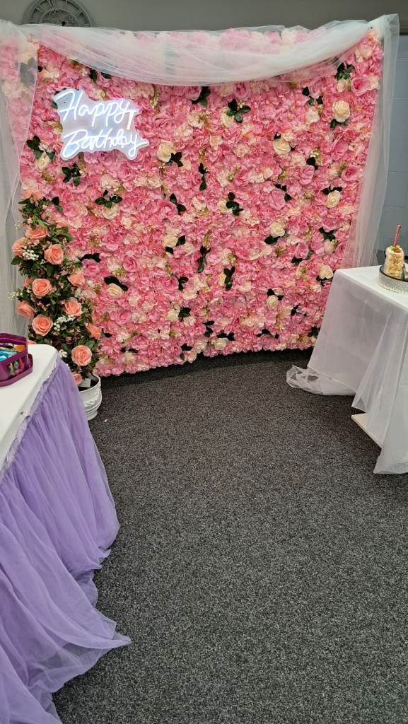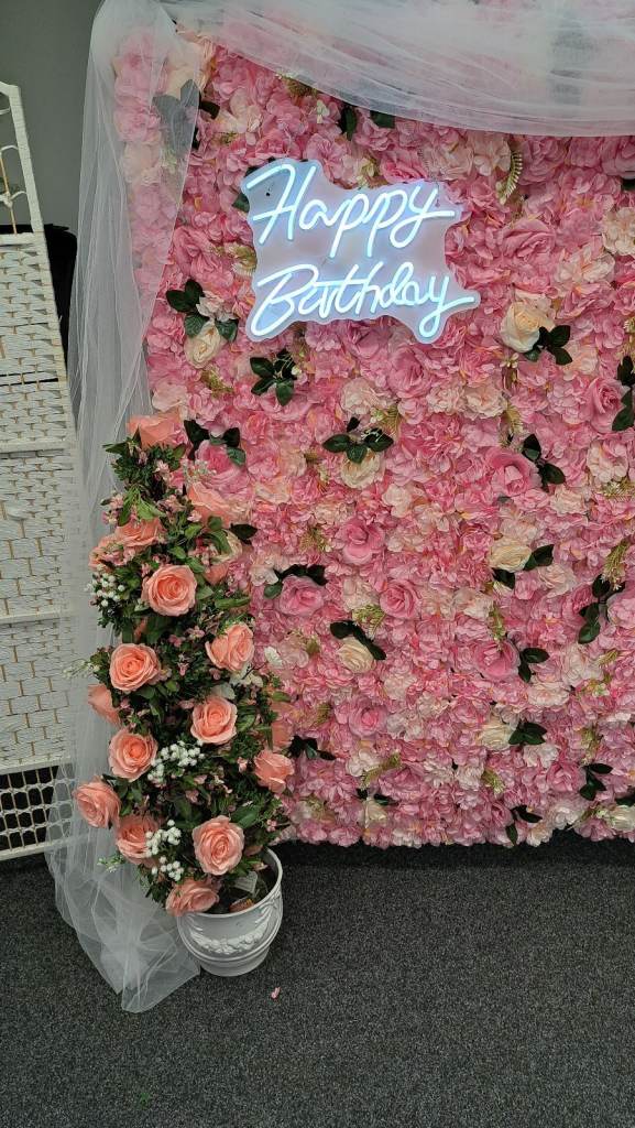 Flower wall for display at any party. With small table , light up birthday sign and speaker to play music.