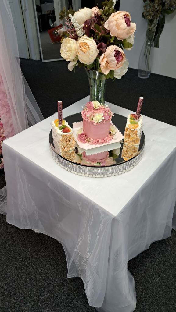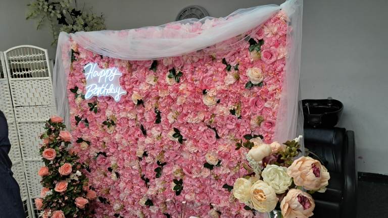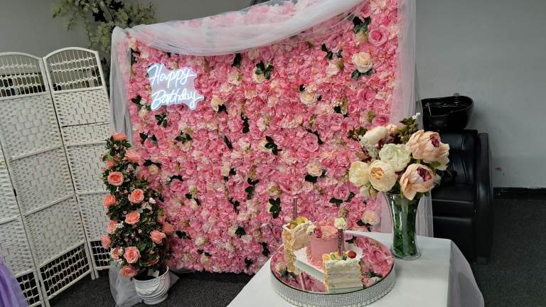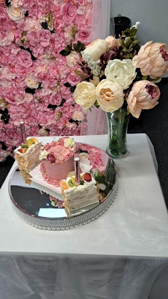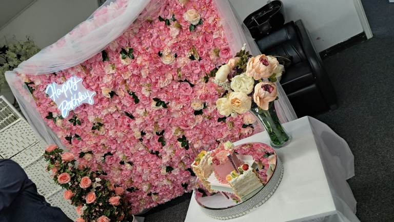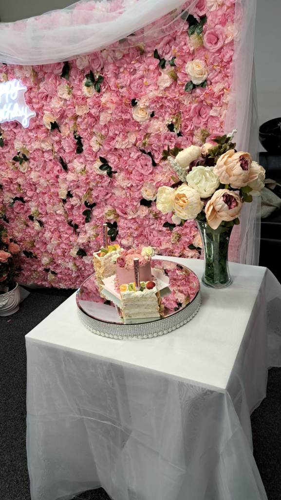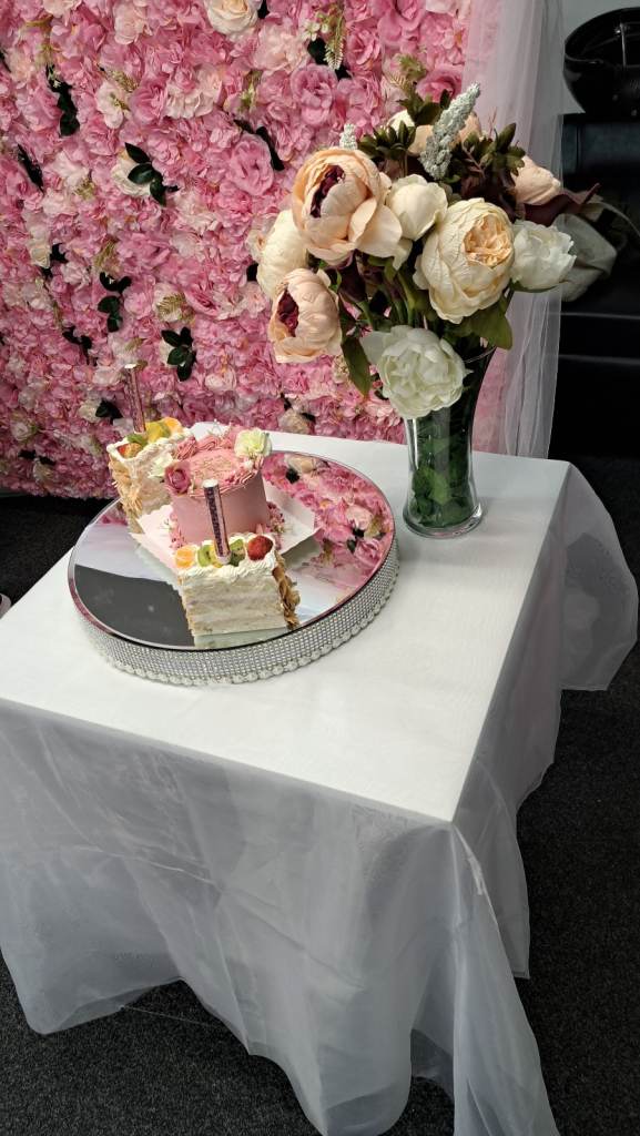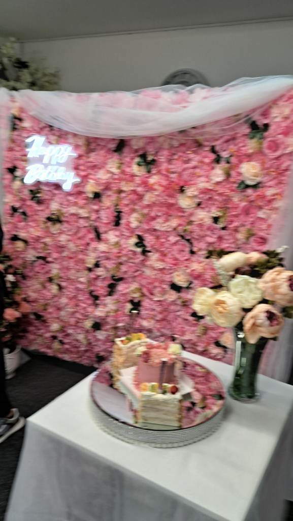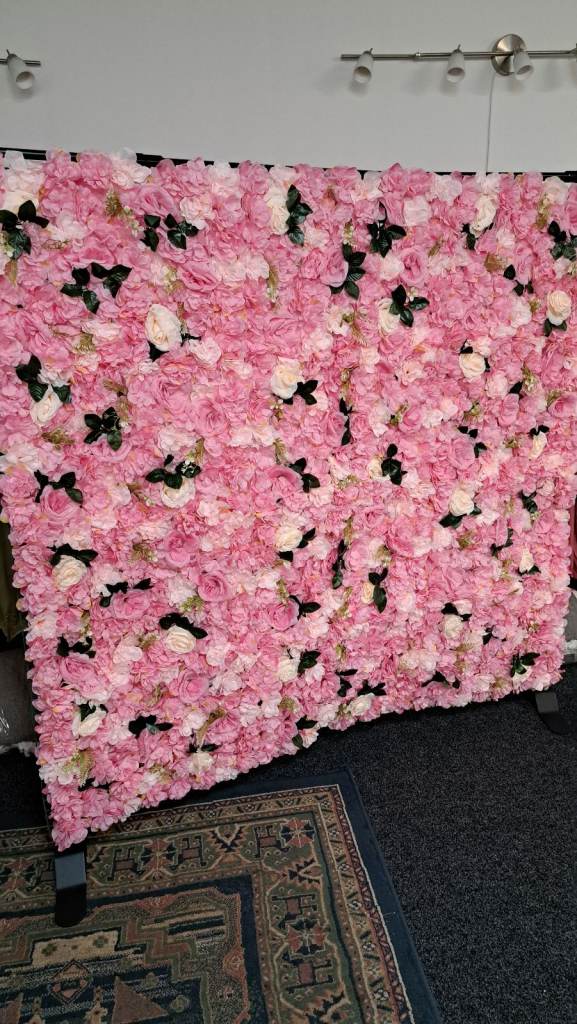 Flower wall for display at any party. With small table , light up birthday sign and speaker to play music.