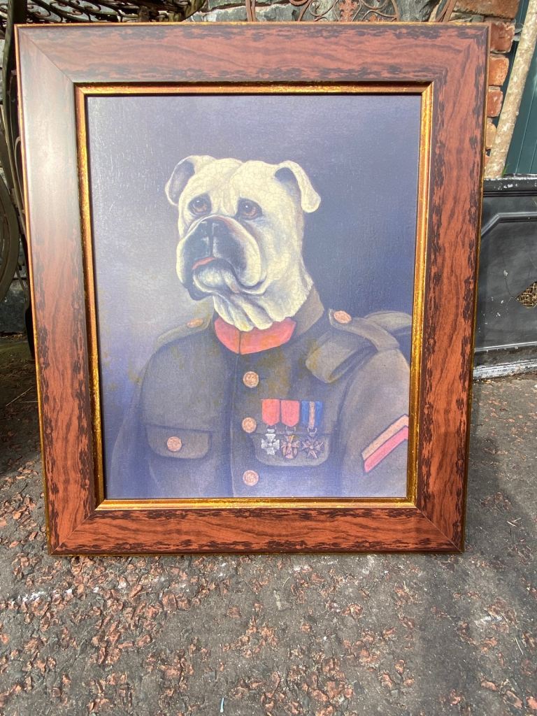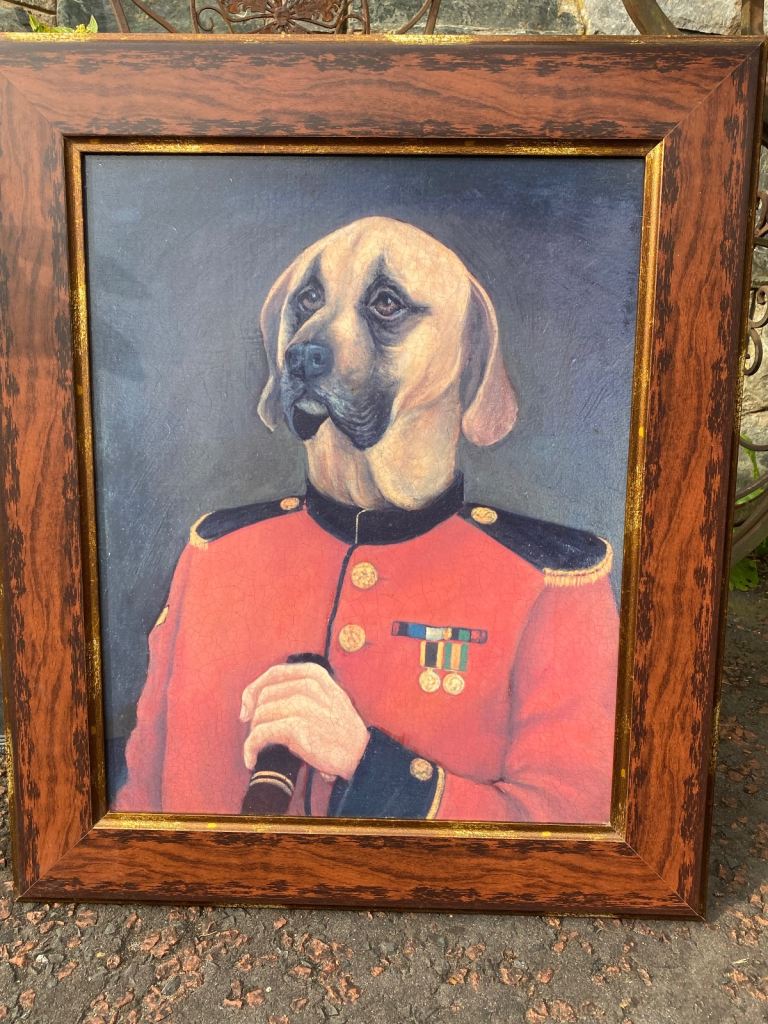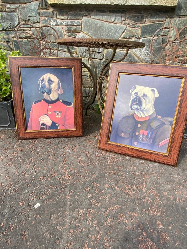 Stunning framed prints of uniformed dogs in a polished wooden frame.
