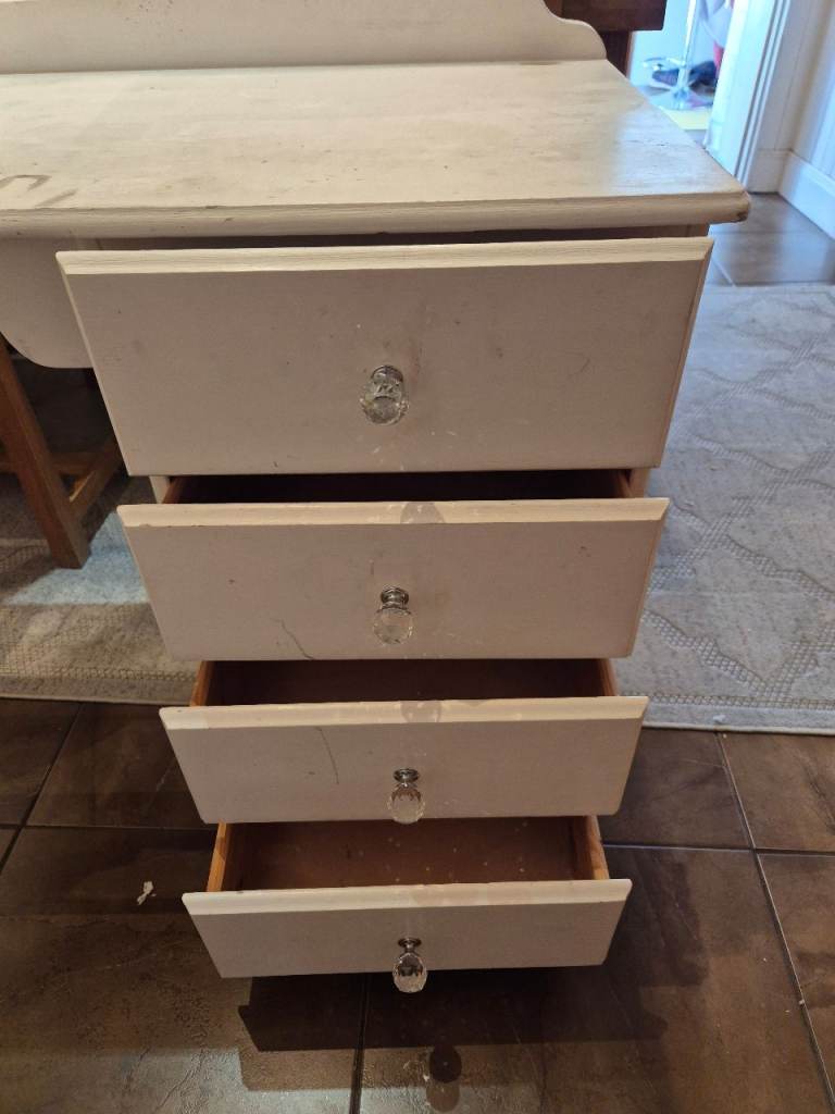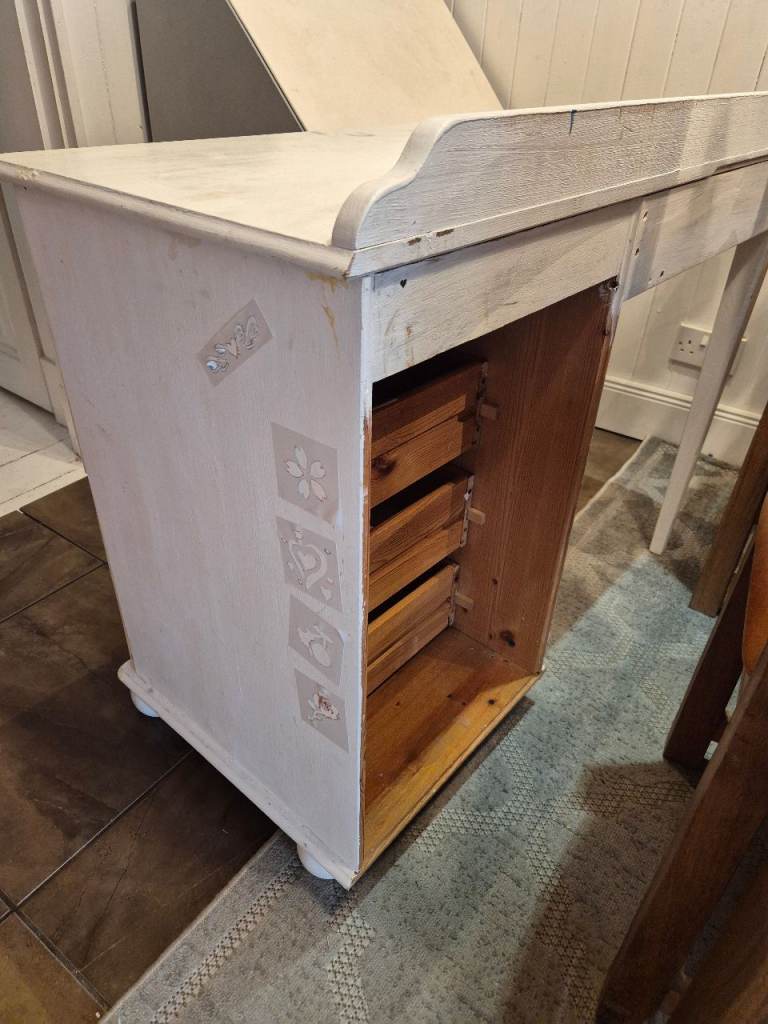 Free pine desk. Was beautifully upcycled by a professional but then was doodled on by a teenager!!! Just needs a sand down and a paint and would be back to it's former glory.