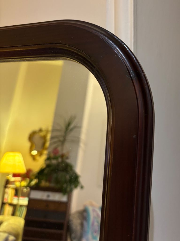 Freestanding full-length mirror with wooden frame and side posts. Strong and in good condition. Mirror brass side fittings allow mirror to be tilted to suit you. Ideal for bedroom or dressing room. Adds light to interior space.