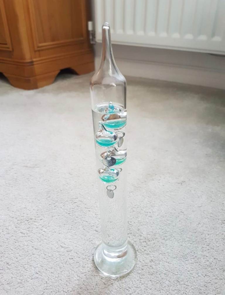 Galileo Thermometer. Stands approximately 30cm tall. 4 x floating glass temperature indicators ranging from 19° to 25° (turquoise in coloiur)
