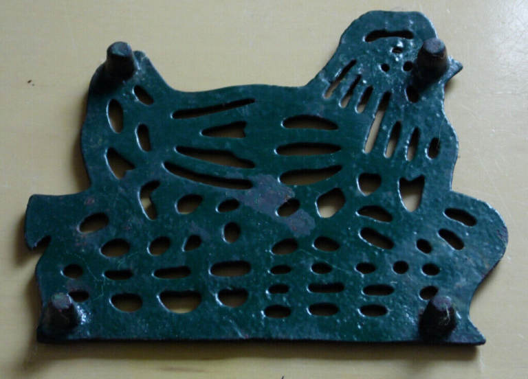 GREEN CAT IRON TRIVET HEN / CHICKEN IN NEST THIS ITEM MEASURES 6 INCH WIDE x 5 INCH TALL IN GOOD CONDITION