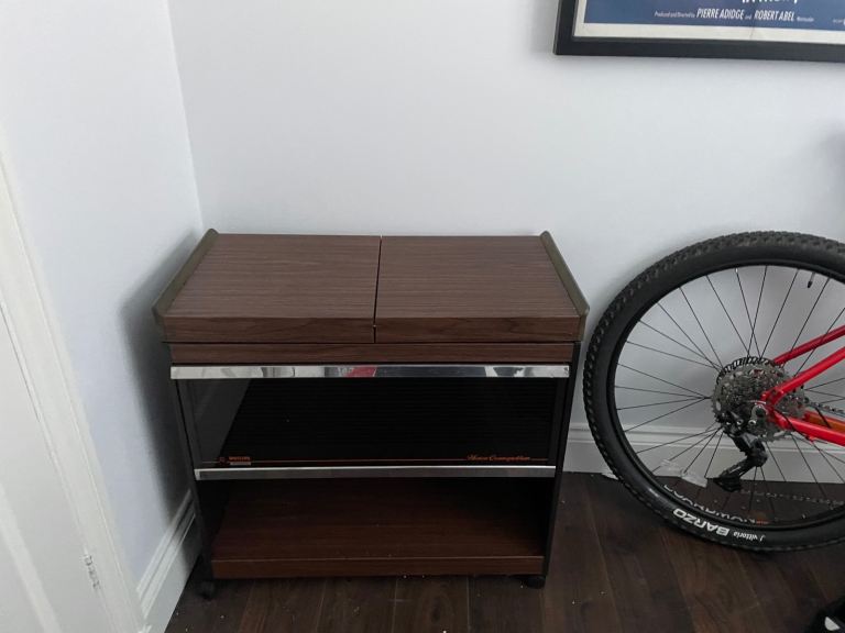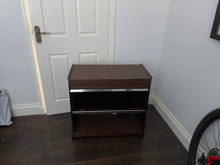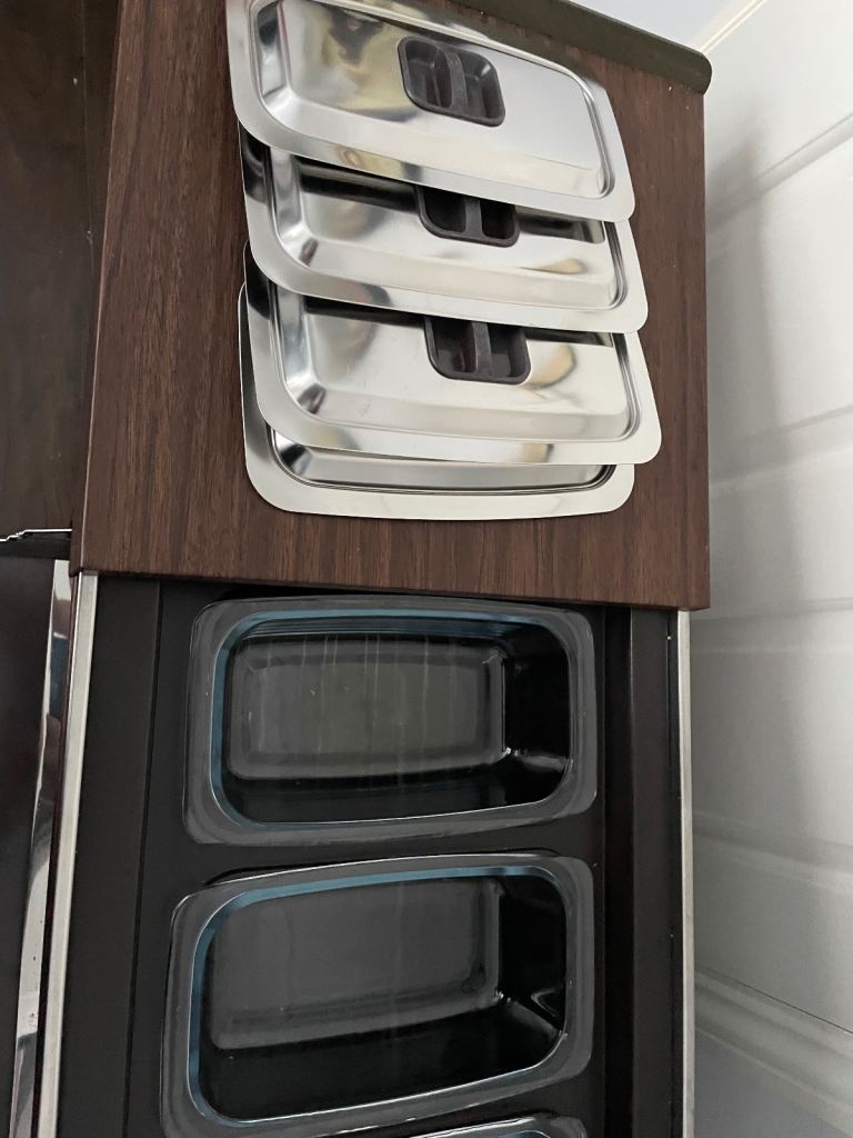 Hostess trolley with warming cupboard and 4 glass dishes with lid.
