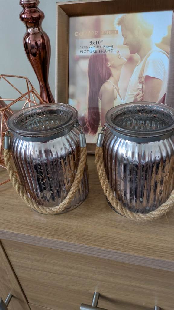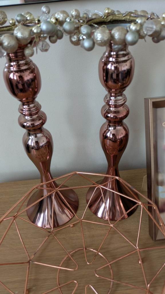 Rose gold tone large candle sticks fruit bowl photo frame glass vases bundle. All in excellent condition sa16Hh