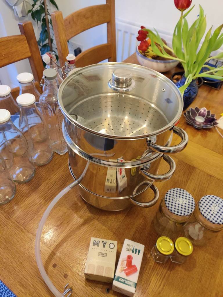 Selling my stainless steel juicer due to move. Only used once to make apple juice and jelly so its condition is excellent. Comes with several glass bottles,cork set and a couple of jam jars.