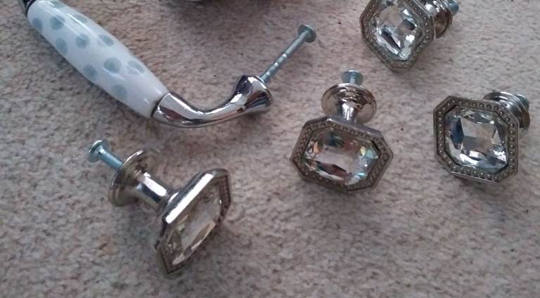 5 assorted draw / cupboard Knobs with fixings. 4 matching and 1 single. 1 is large and 4 smaller.