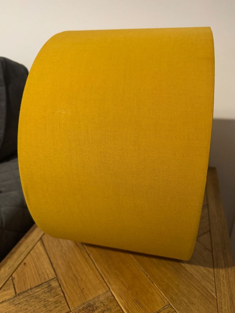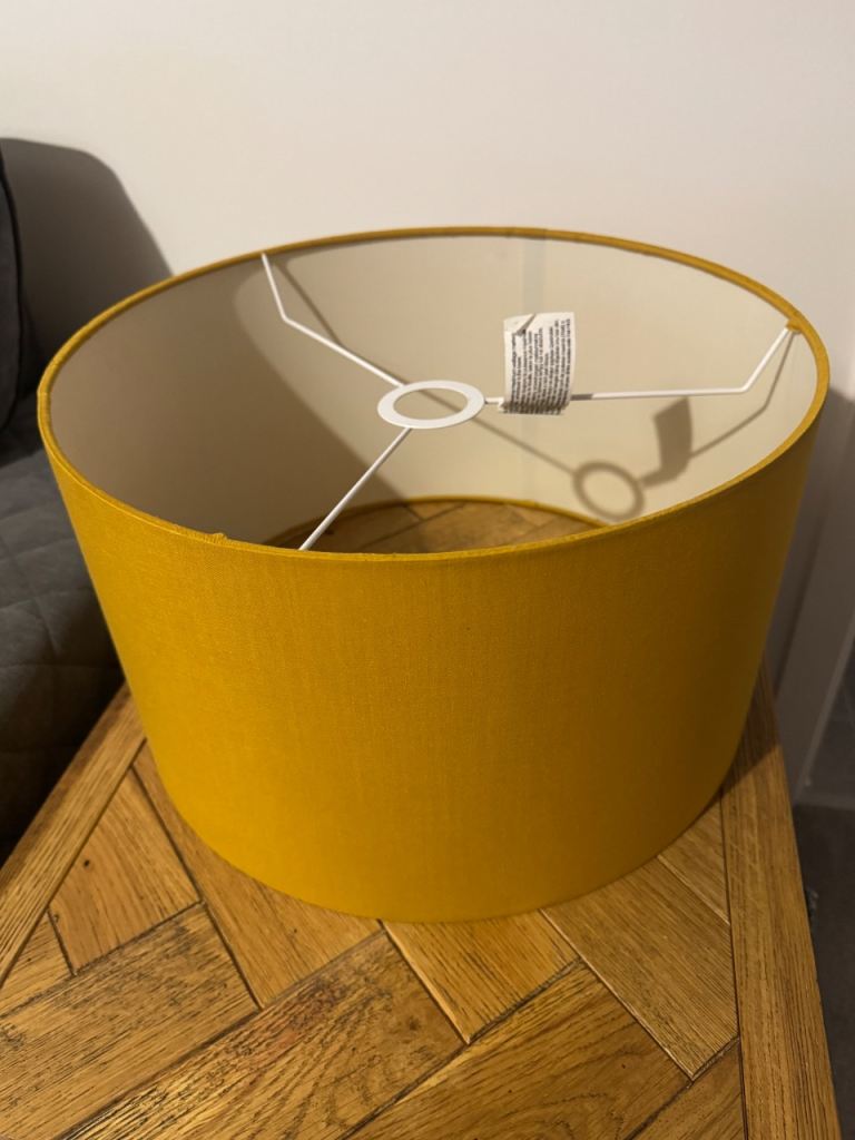 Mustard fabric lampshade. Approx 40cm 16” diameter. 13cm 9” deep.