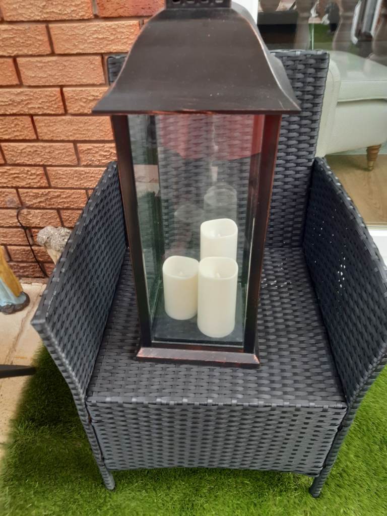 Lantern indoors/outdoor comes with 3 battery operated candles immaculate condition can be viewed Chapelhall Buyer collects No Posting