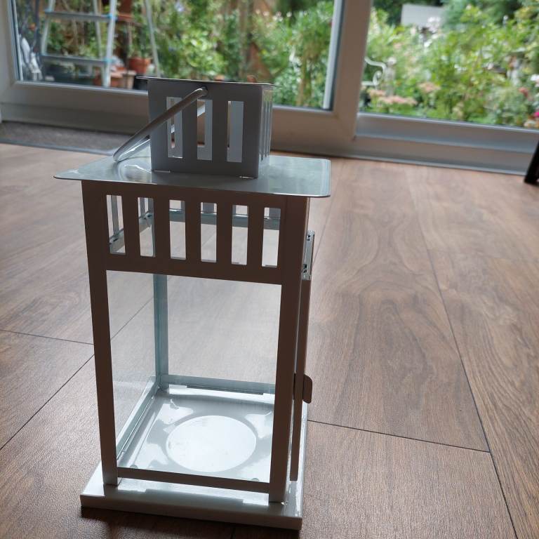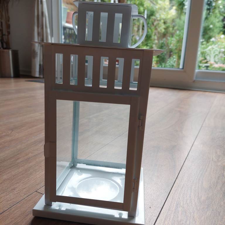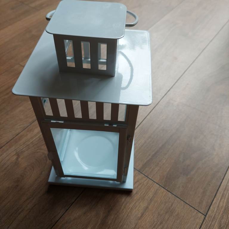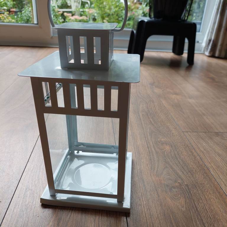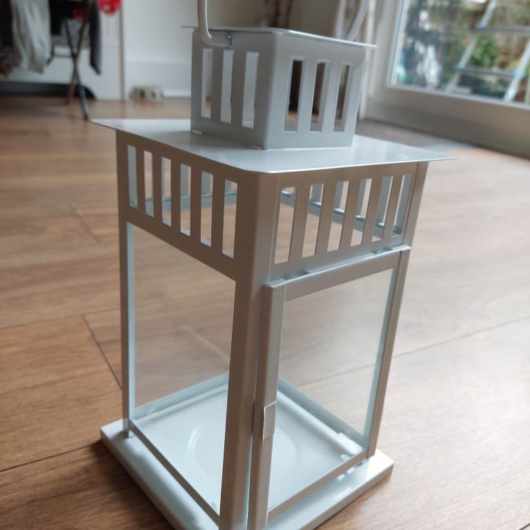 Large white metal lantern with glass panels and carrying handle opens at side for a candle indoor or outdoor use size 17-1/4 islington area n1