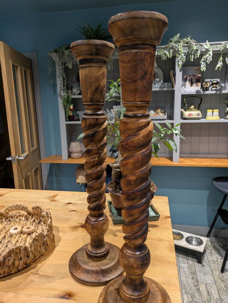 Pair of large Mango wood candle sticks 64 cm high ideal for flower arrangements