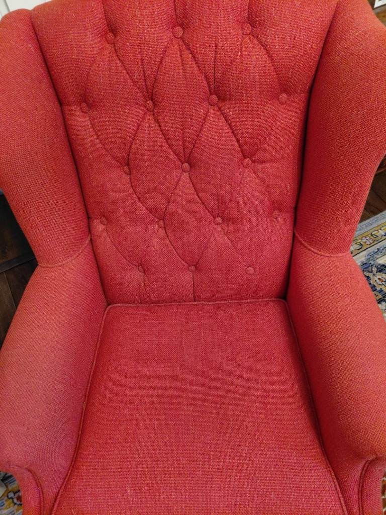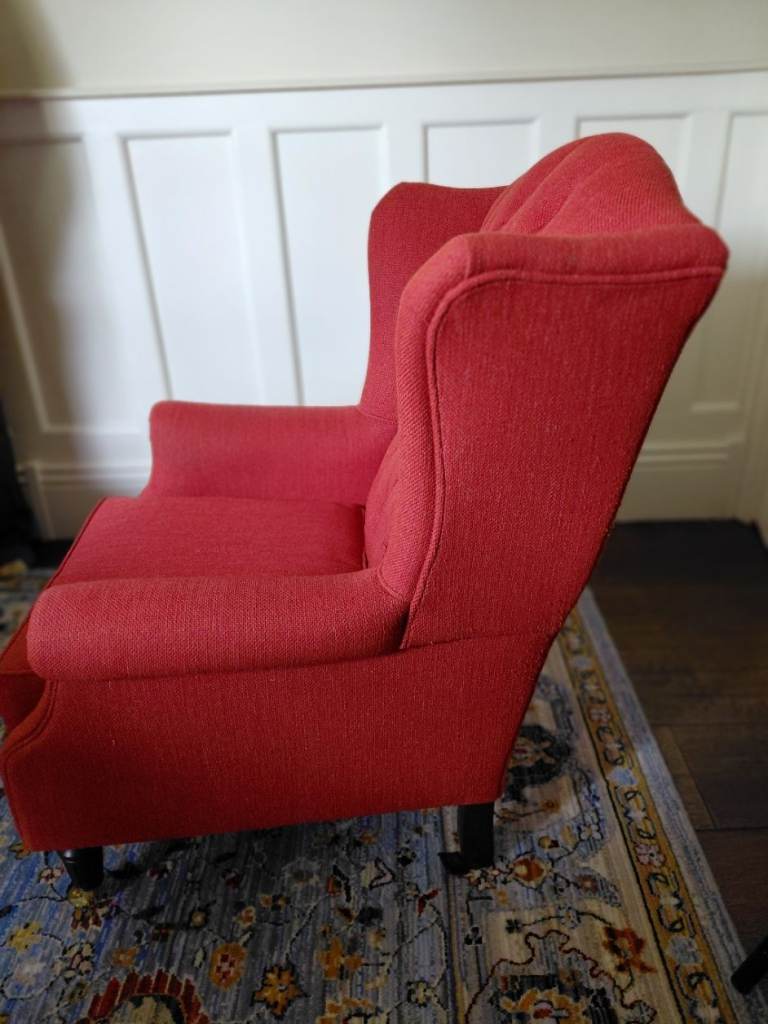 A Wing Back Chair made by Laura Ashley. The chair is in very good condition and has been well looked after. It has 4 small feet, the 2 at the front having castors so can be easily moved. As the pictures show it is a rich Terracotta colour. So sorry but can not deliver.