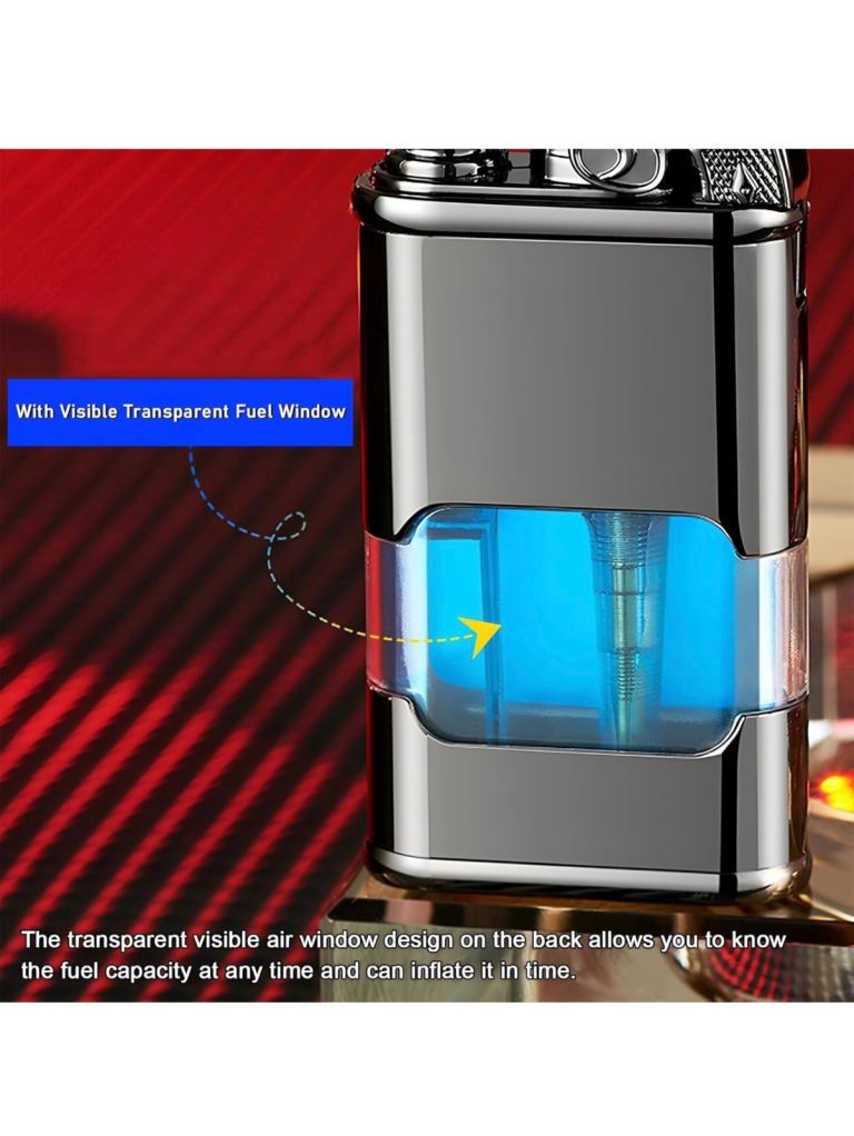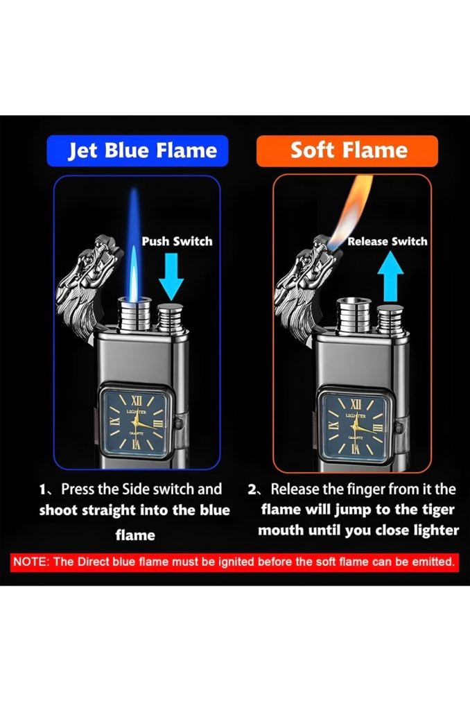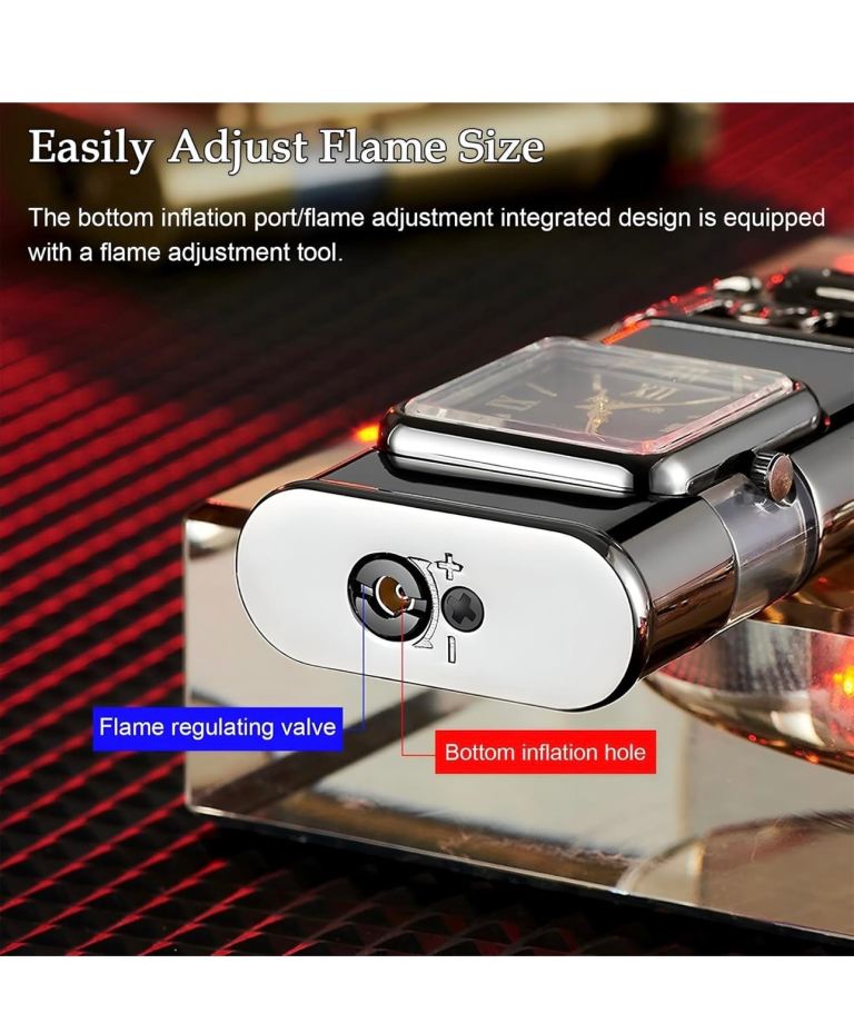 Double flame embossed watch windproof lighter, can switch between soft flame and straight flame at will, can be filled with butane, with visible air window, adjustable flame, gift for men (fuel not in