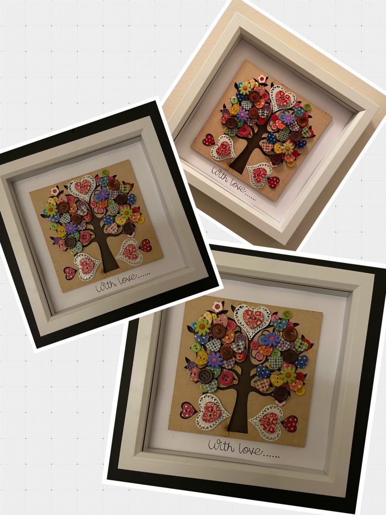 This is made by attaching a wooden shaped tree to the inner frame , then various buttons are attached. The wording can be changed as long as it fits within the frame. Designs will vary depending on buttons available.