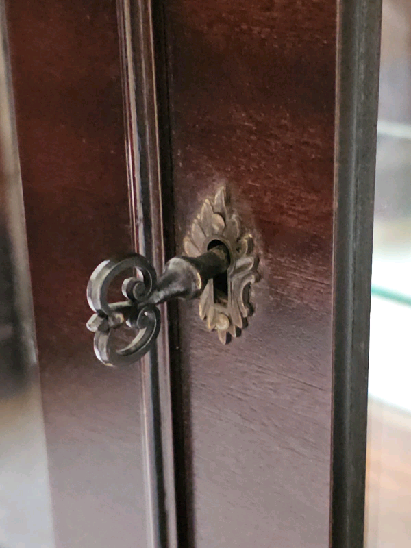 Two glass shelves. Engraved glass doors. Doors lock with a key.