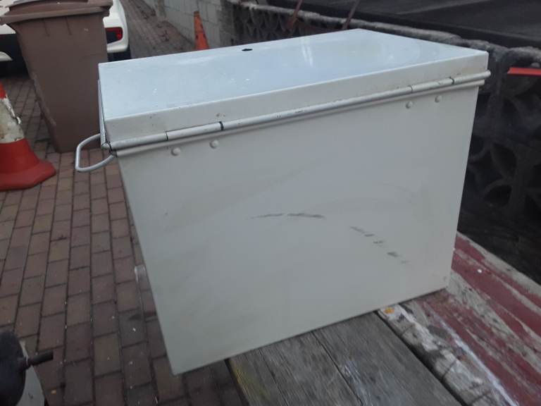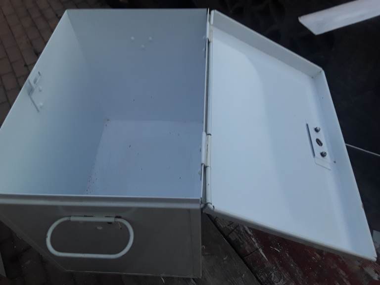 NEW WHITE PAINTED METAL BOX..WELL MADE UNUSED ..WOULD MAKE GOOD FIRST AID BOX OR PERSONAL LOCKER WITH LOCK FITTED SIZE 16L X 11W X 13 H