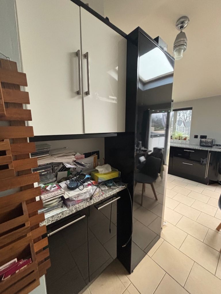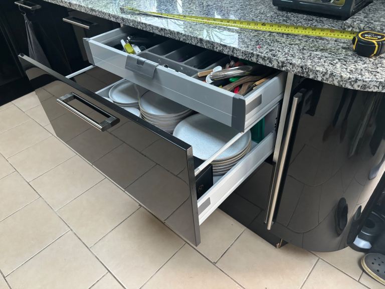 Modern Howdens Black and White Kitchen with stone quartz work surfaces