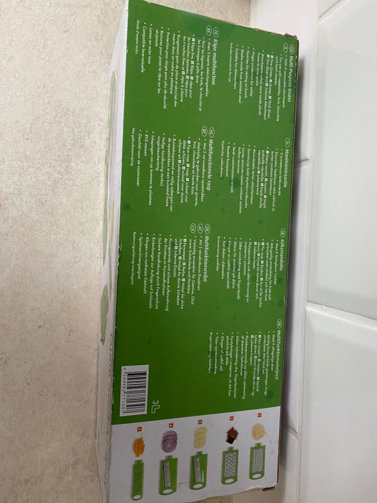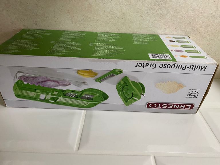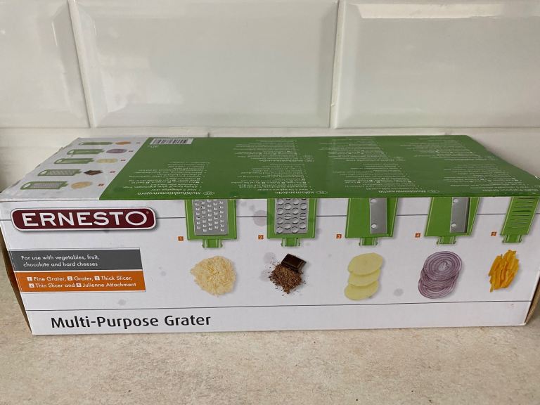 Multi purpose grater. Brand new with 5 removable attachments. For use with vegetables, fruit, chocolate and hard cheeses. Attachments store safely inside the compartment frame to save space. Blades made from stainless steel. Suitable for dishwashers. It comes with instructions