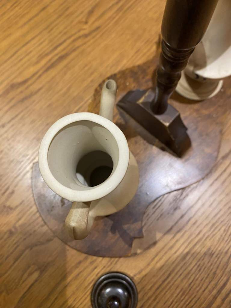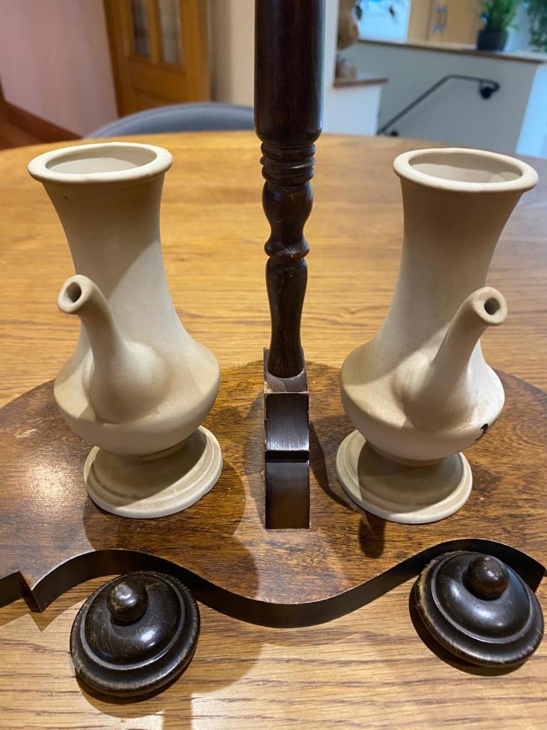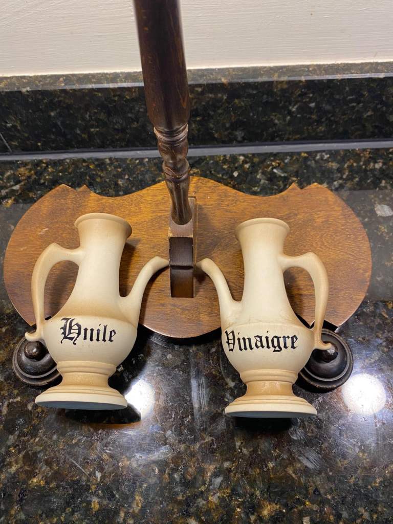 Very attractive set purchased in France around 50 years ago. The jars are not glazed so never used to hold oil or vinegar but placed on display. Set on a wooden stand which can be taken apart if needed.25