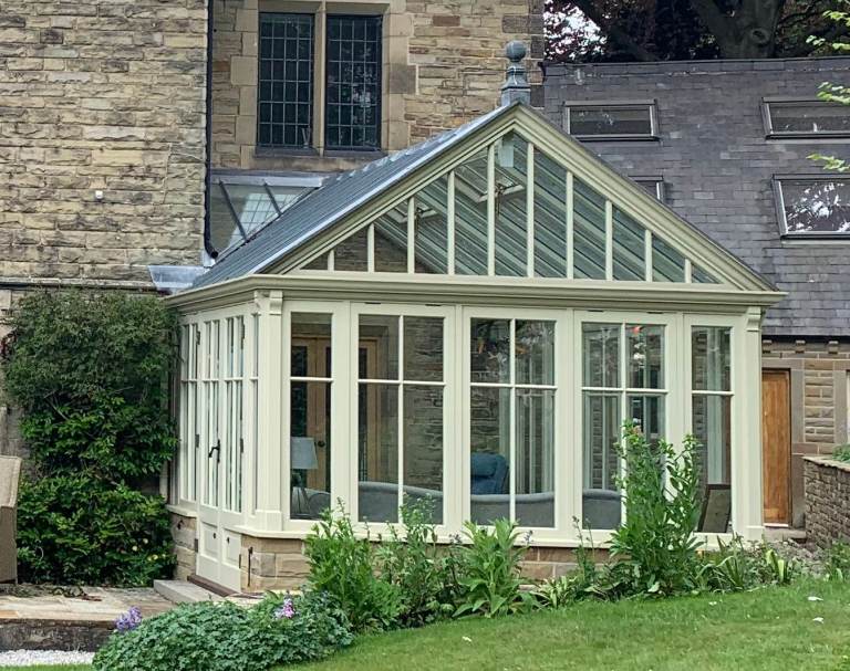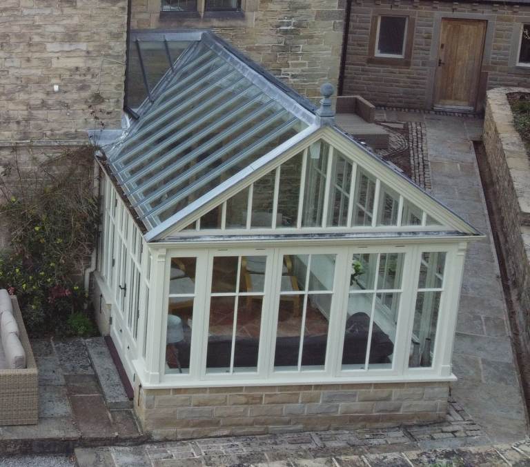 Manufactured by Vale Garden Houses, hardwood and double glazed orangery including numerous opening windows and roof vents, very carefully dismantled.