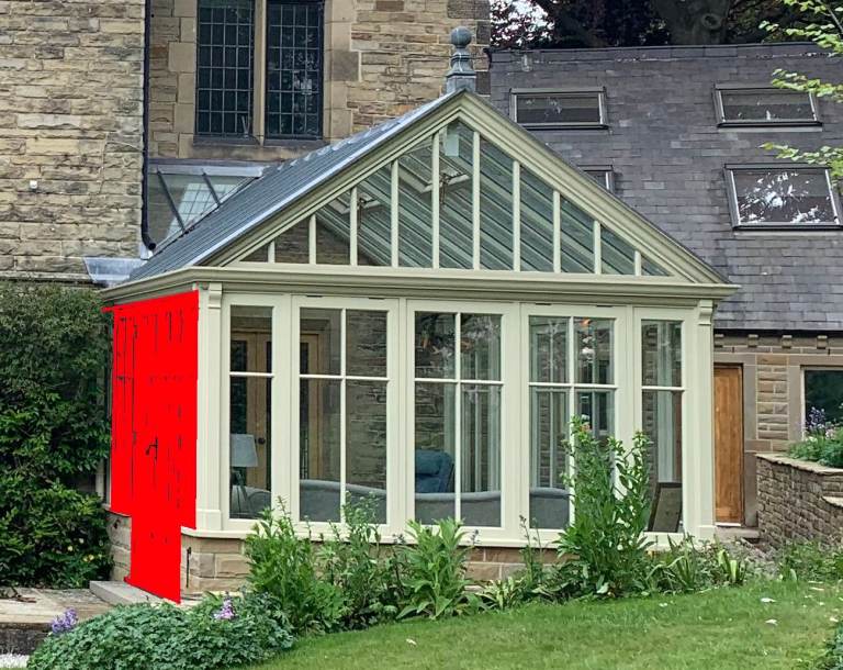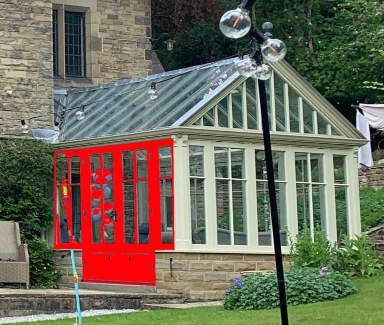 Includes all timber and glass elements, other than the double doors highlighted red on the attached pictures and the stone base.