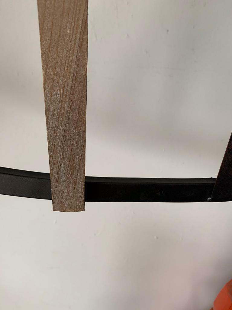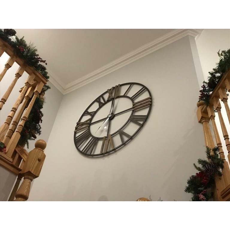 This is a two tone colour palette of iron antique grey frame with bold wooden numerals industrial looking oversized (120cm) battery operated (x1 AA) clock. Hanging arrangement behind the number 12 for wall hanging.