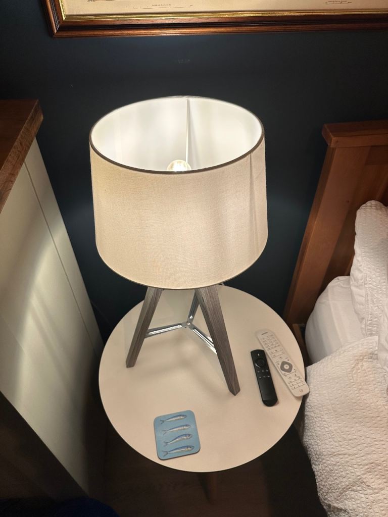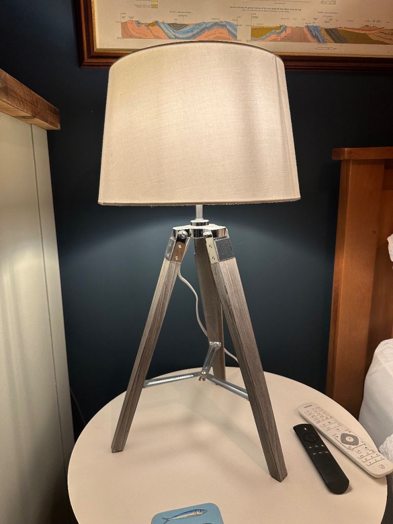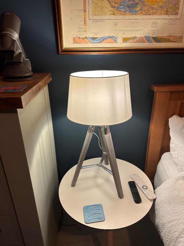 Pair of bedside or table lamps with wooden tripod stands, from John Lewis so good quality, Height 65cm, as new condition, price for the pair
