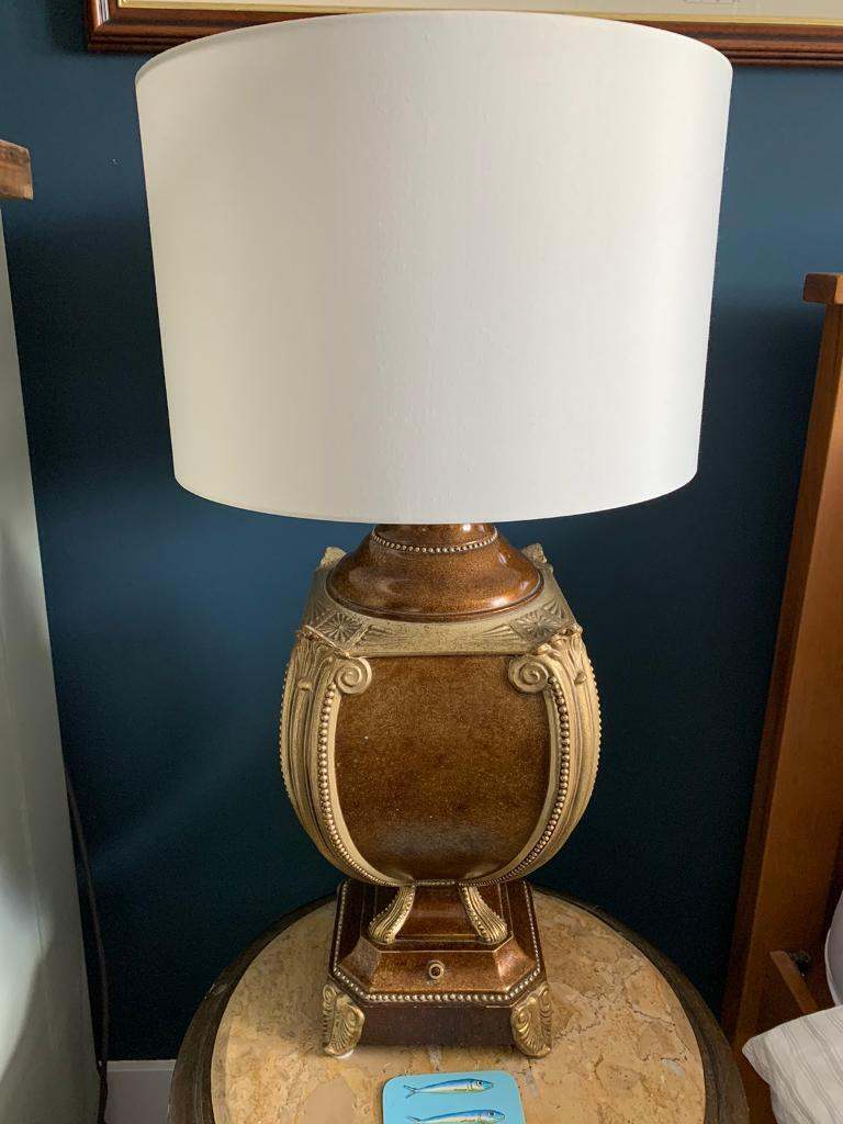 Pair of table lamps, base made of metal sheets so solid but not too heavy, real statement pieces, dimensions- Total Height 68cm / Lamp Sahe 35 cm diameter/ Width of base 22cm at widest point, price is per lamp. Can be collected from Bradley Stoke also