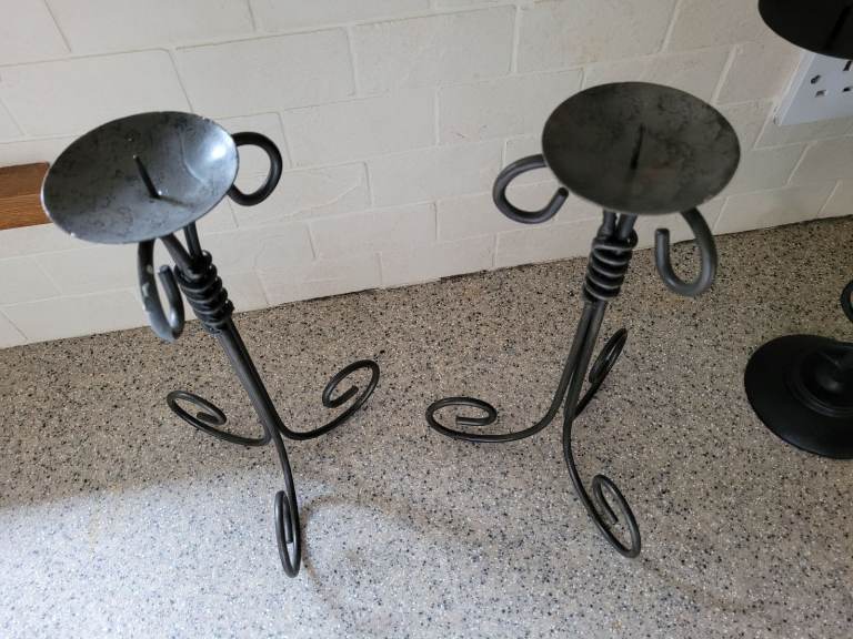 One pair of ornate single candle sticks - black metal, both in excellent condition. £10 for the pair.