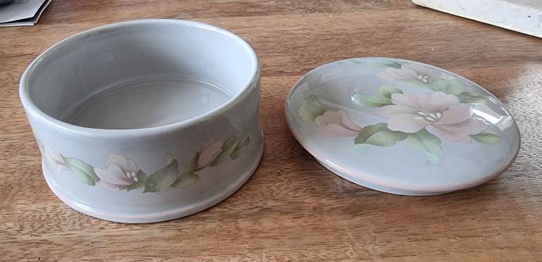 Very pretty pale grey china trinket box with pink/peach floral design. Approximately 9 cms in diameter by 4.5 cms high. In perfect, as new condition.
