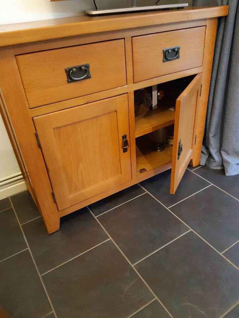 Solid pine sideboard with 2 drawers and internal shelf. Good condition