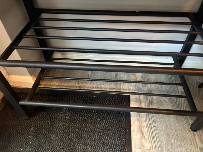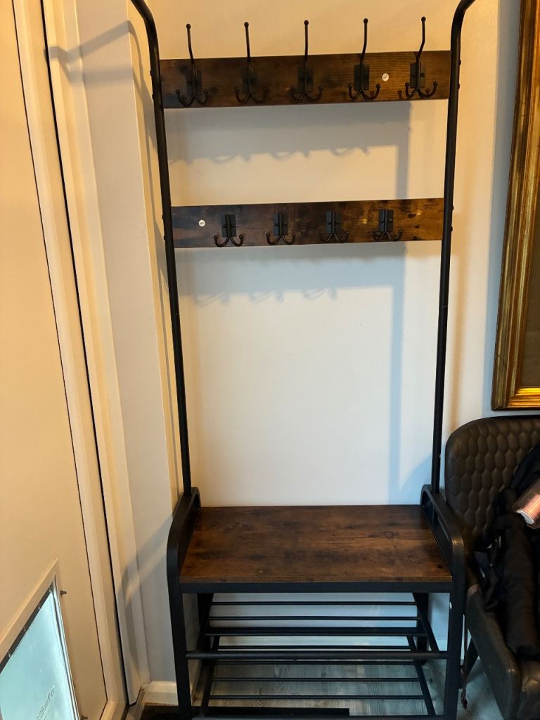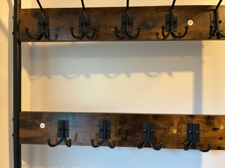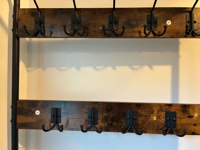 Great for outdoor coats and shoes, dig leads etc. Rustic wood and black metal rungs