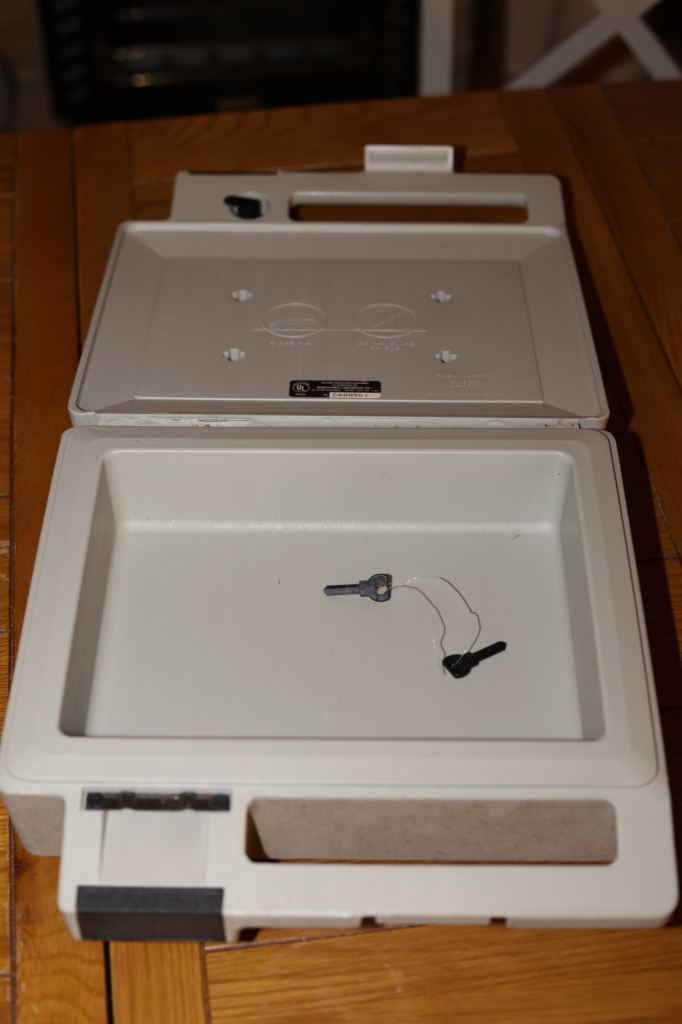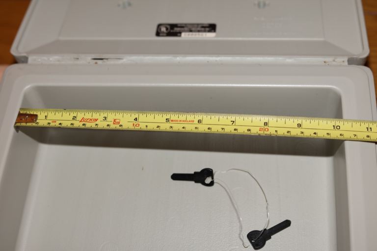 I have an old fire-proof box which I haven't used for a long time and am now having a clear out. The pictures give a better description of it than I can do in words, but I would note that the hinge of the box has cracked somewhat with age but seems firm enough for now. It could probably be made good with some gorilla tape or the like. That said, the box is a good solid case that should do it's job as stated, and comes with two keys. The interior isn't massive - just slightly less than an A4 sheet of paper in length and width directions but would be suitable for folded documents, jewellery items, data storage etc.
