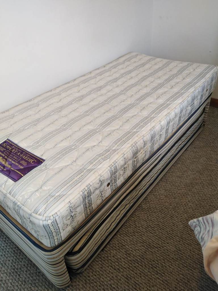 Single bed and mattress with trundle bed underneath pulls out to make a double or two single beds