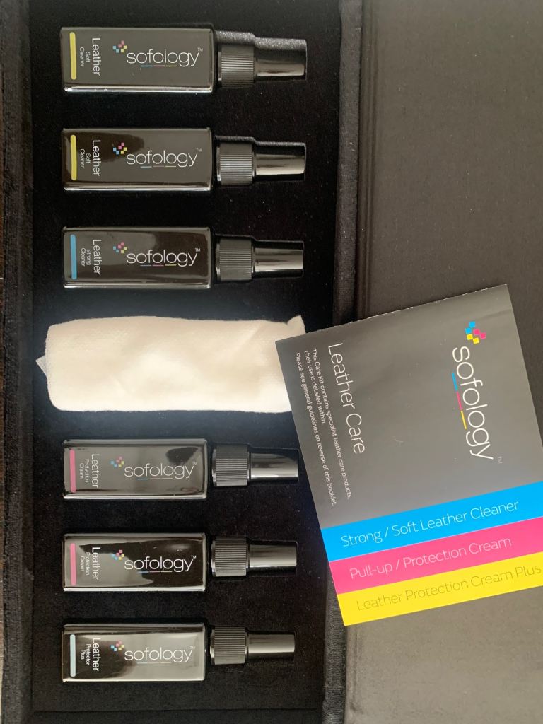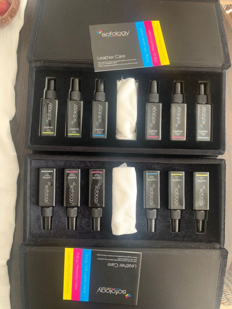 new leather care kit, i have used a few of tge cloths in one box and a little of one of the cleaners. rest is new but bare in mind the bottles feel light and are not full to the top which is how it comes.£20 for two