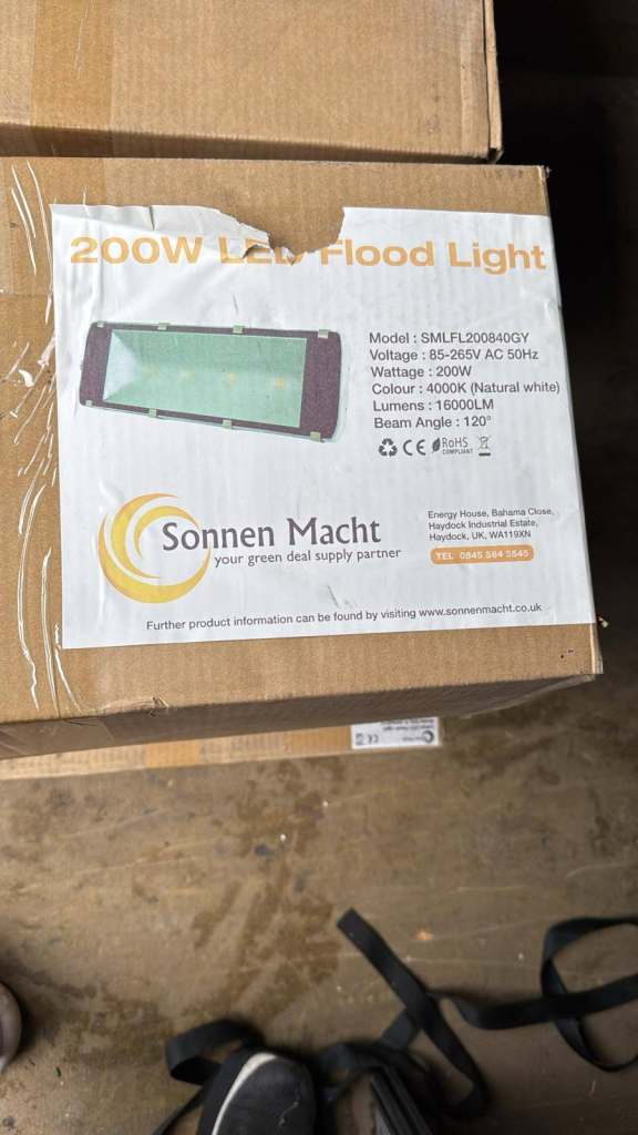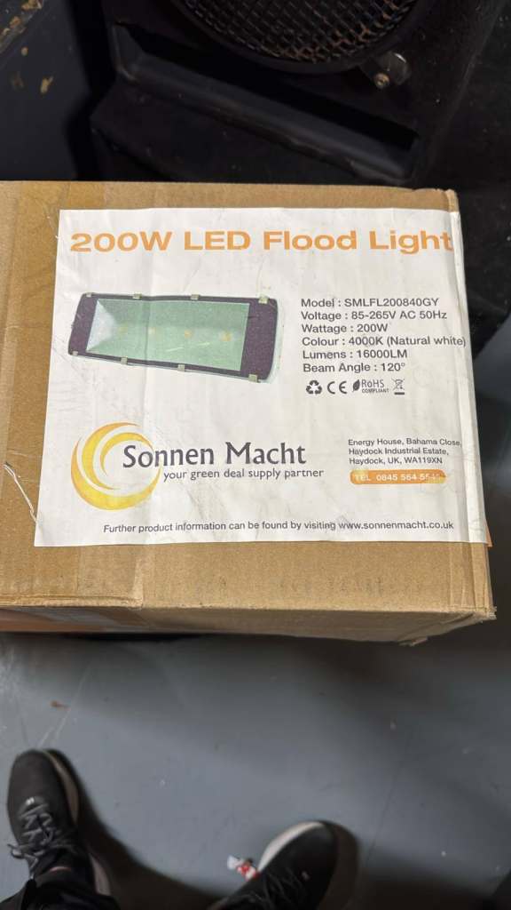 High-output 200W LED floodlights – IP65 rated, natural white (4000K), 16,000 lumens. Ideal for commercial or industrial use.