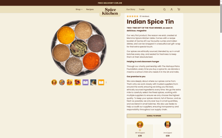 A collection of 9 Indian spices and blends (Garam Masala 20g Cassia Bark 5g Chilli Powder 20g Cumin Seeds 20g Coriander Powder 20g Mustard Seeds 20g Turmeric Powder 20g Cloves 5g Cardamom Pods 3g) in removable pots with lids, includes a stainless-steel spice spoon and mini recipe book, comes in a stainless-steel tin which is gift wrapped in a silk Sari, cost £35, brand new in sealed packaging.