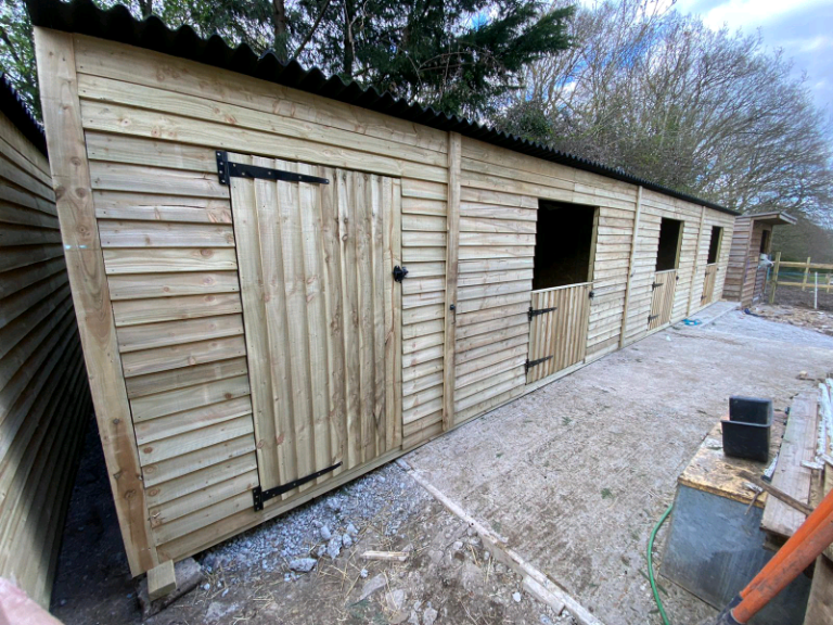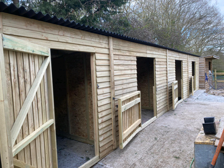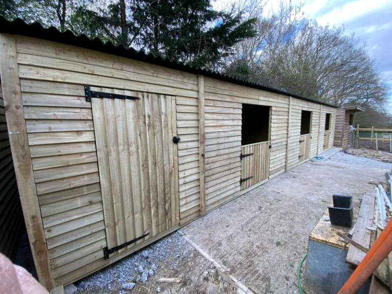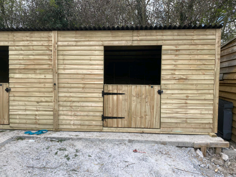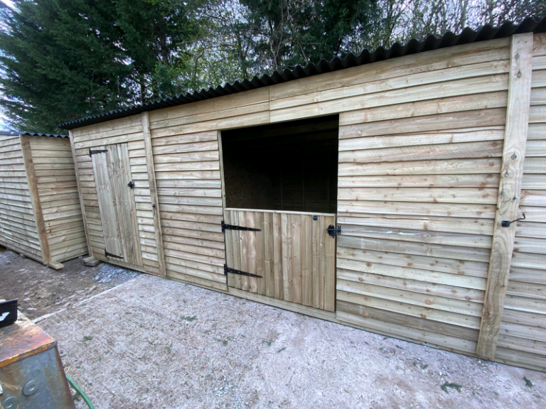 42ft x 12ft block comprising of 3, 12ft x 12ft stables complete with half doors and a 6ft x 12ft store room, 8ft high at the front sloping down to 7ft at the back.