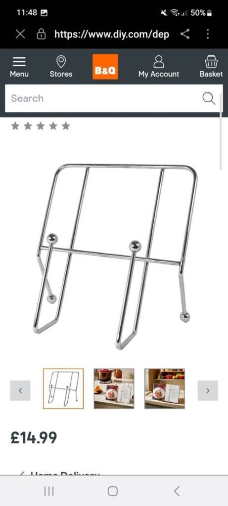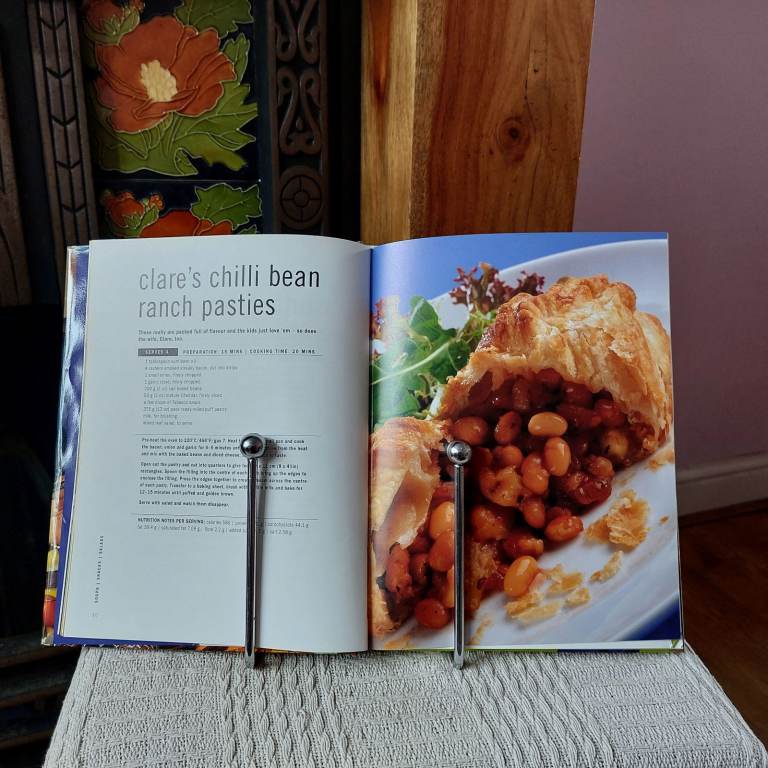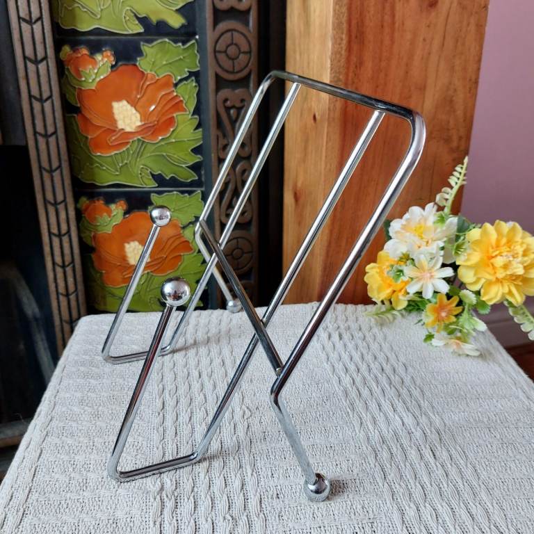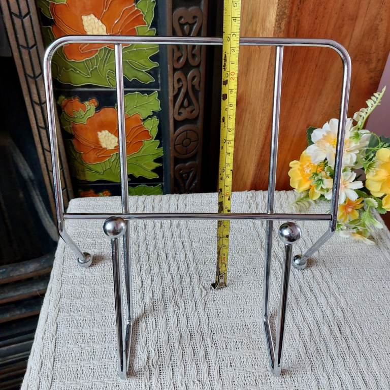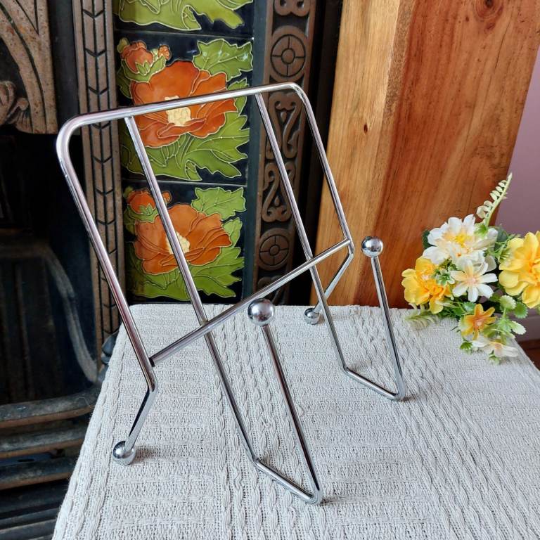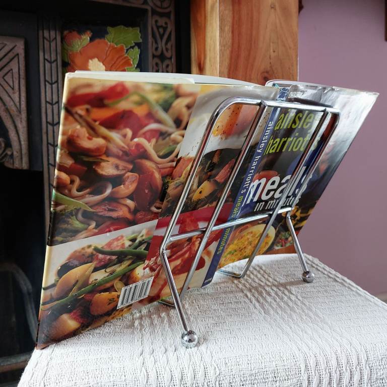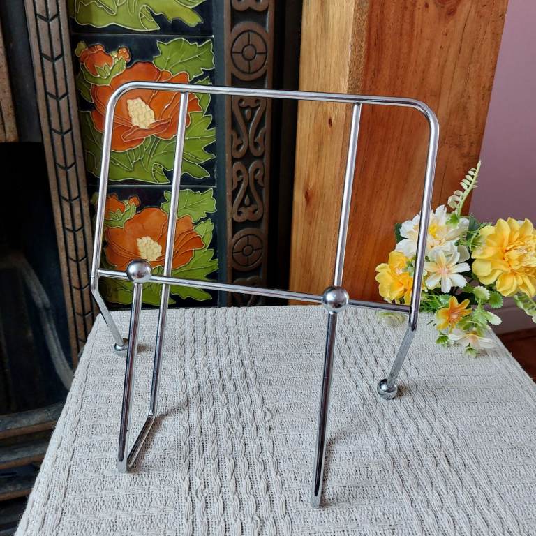 A lovely useful chunky stainless steel recipe cookbook holder stand with decorative steel ball feet and page holders