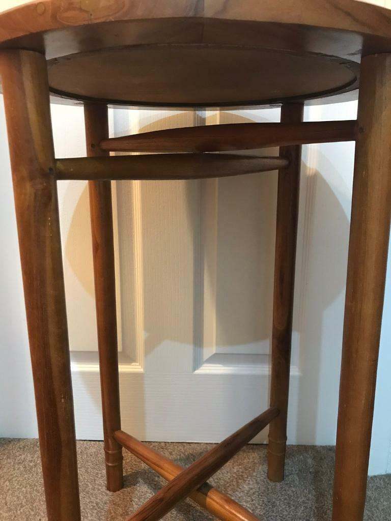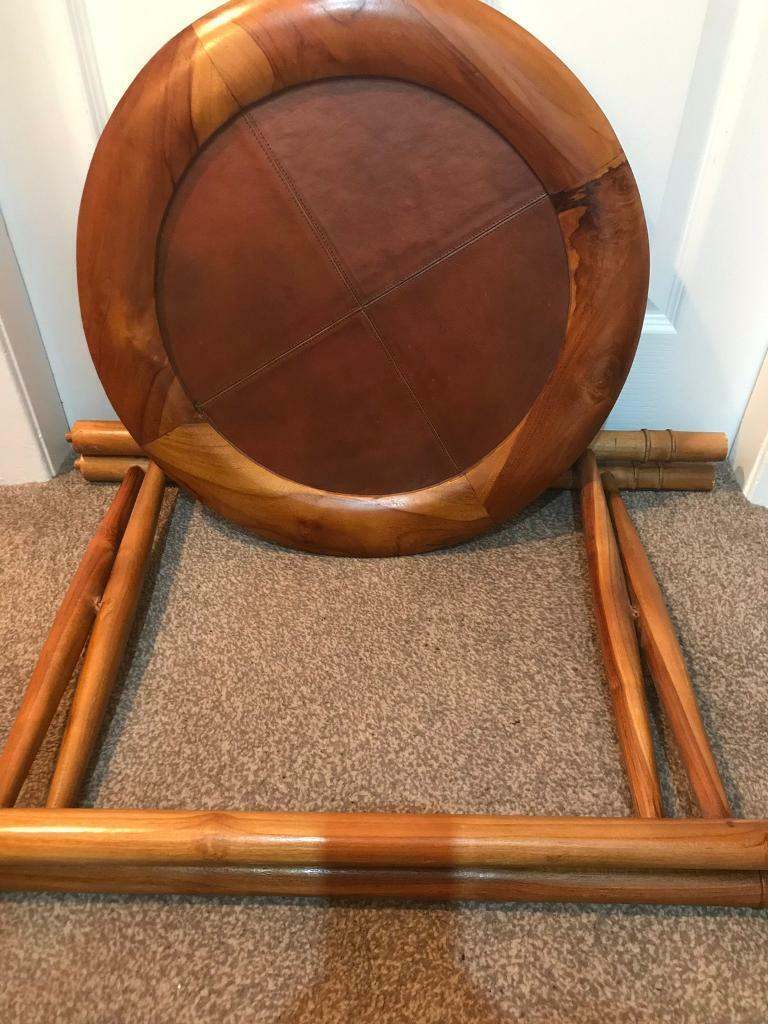 Stunning brand new tan leather and teak wood occasional/side/wine table. Top tray and legs can separate for easy storage. Inspired by the stylish folding safari furniture that was originally made in Britain for the British Army serving in India, this table is perfectly suited for relaxing alfresco. This classic collection adds a touch of class to any indoor/outdoor space and is also easily transportable should you wish to venture to thebeach and soak up the sun in style. Size 70 x50 x 50 cm. Instructions included.