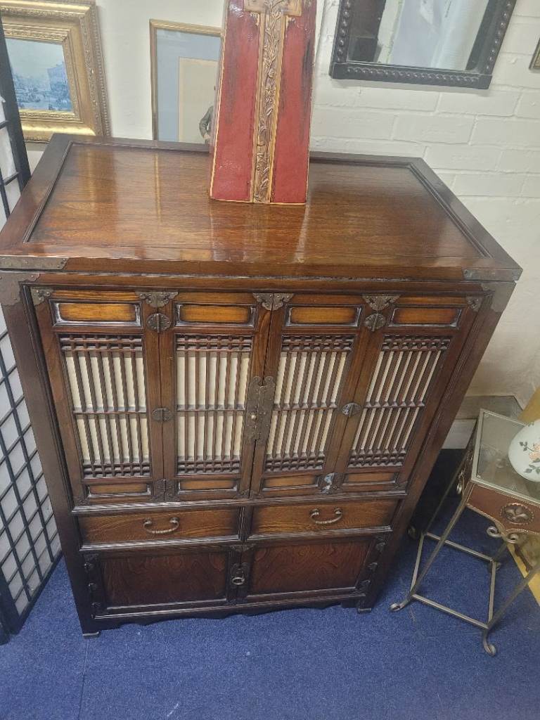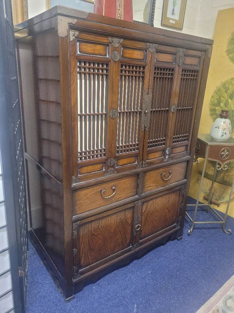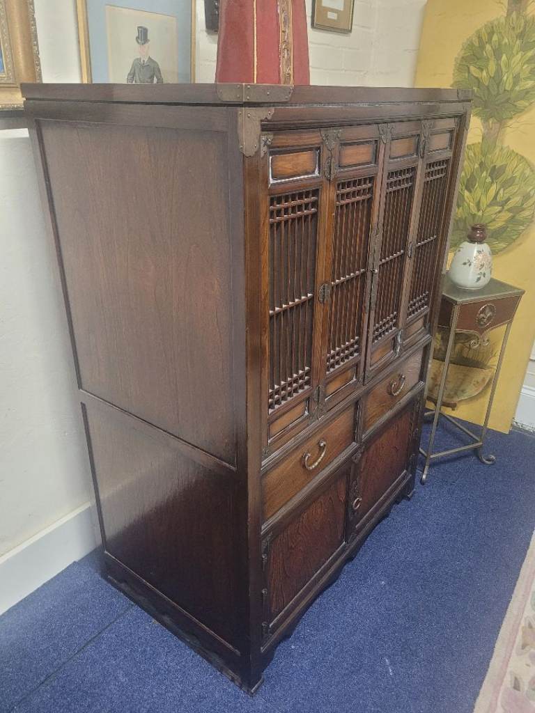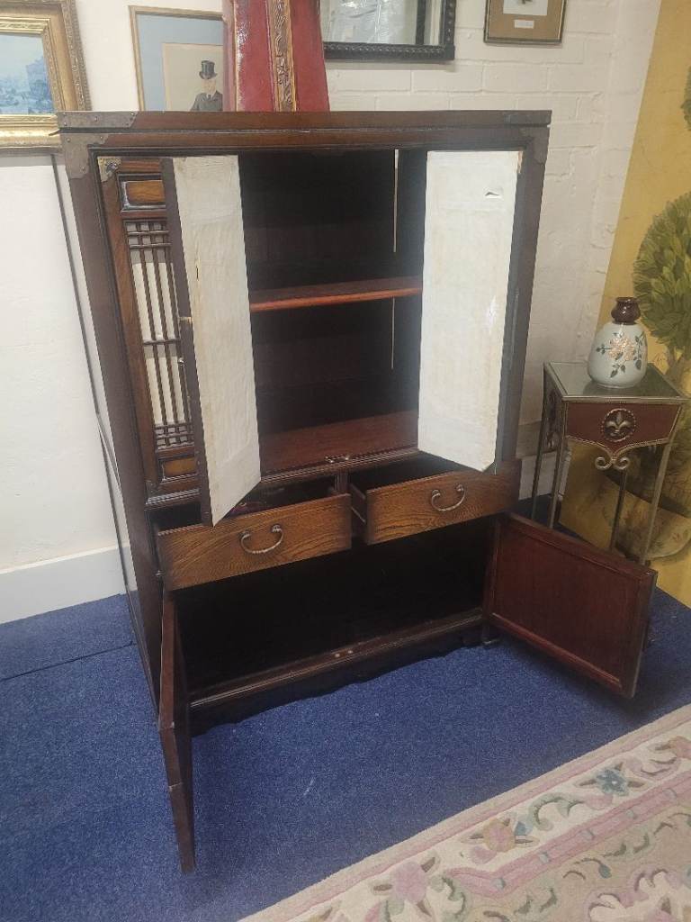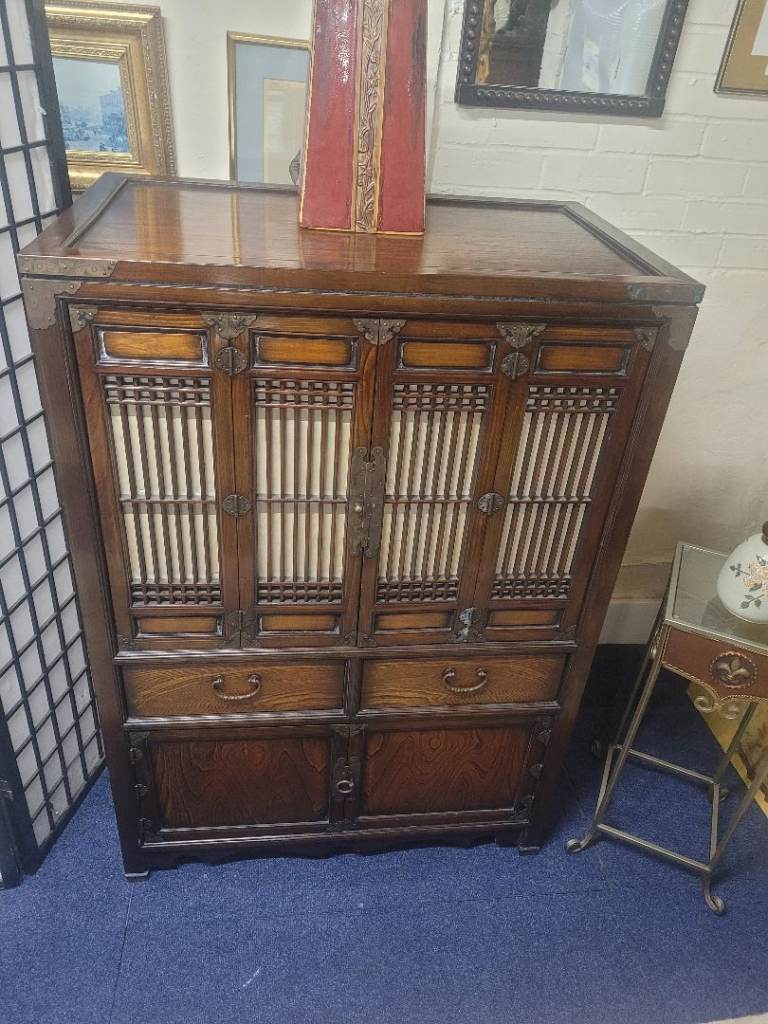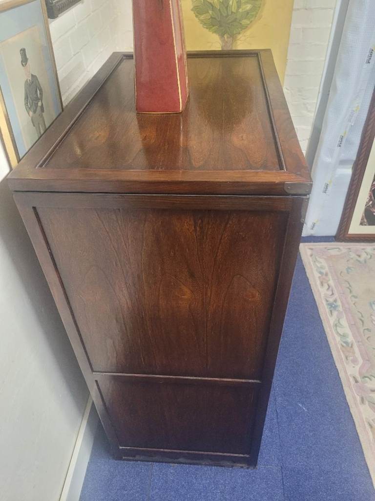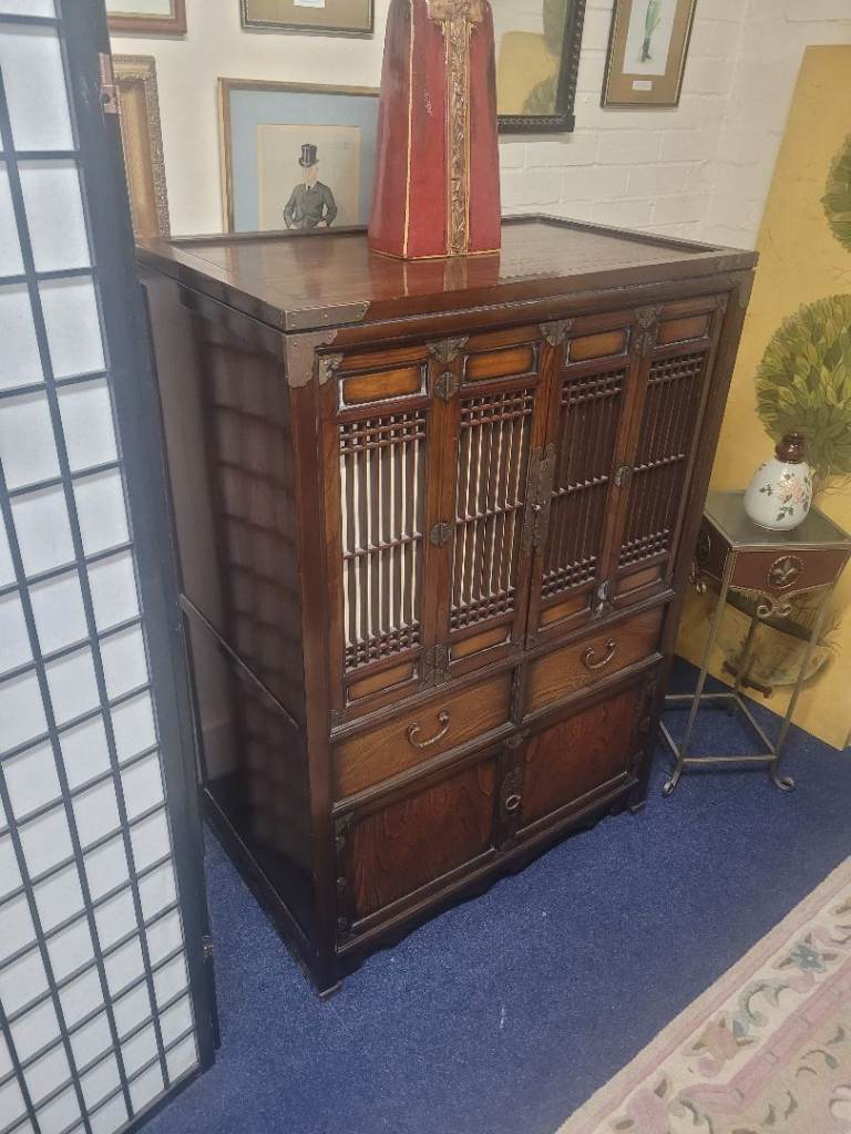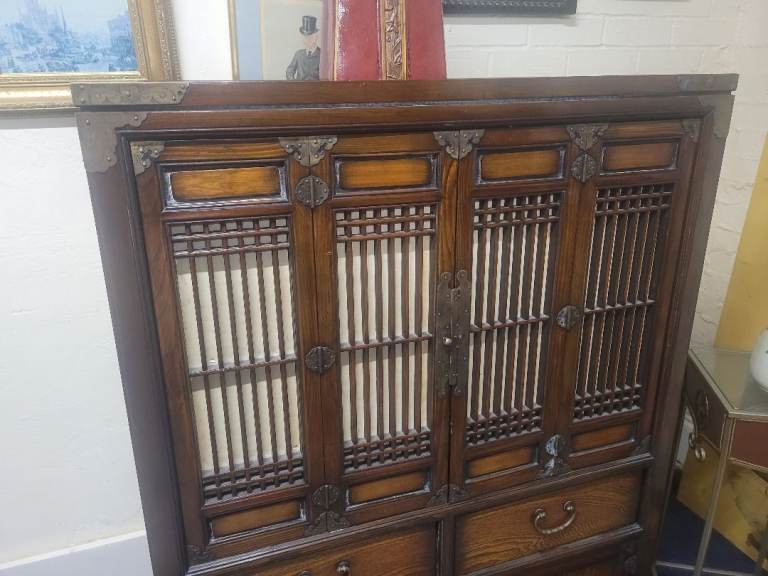 Has large cupboard above 2 drawers with a smaller cupboard below