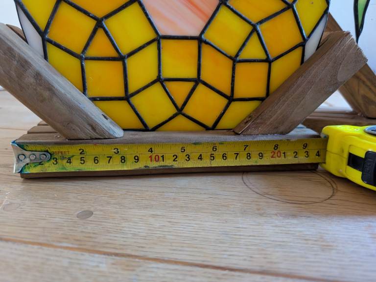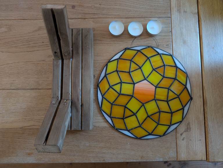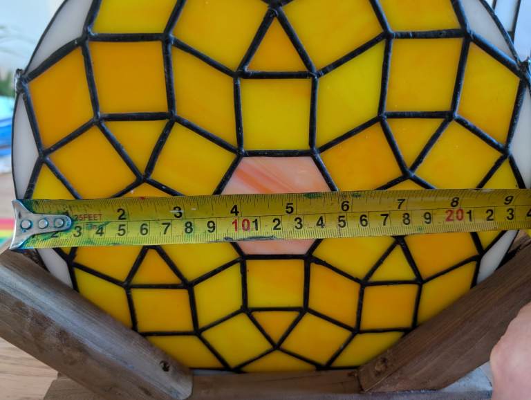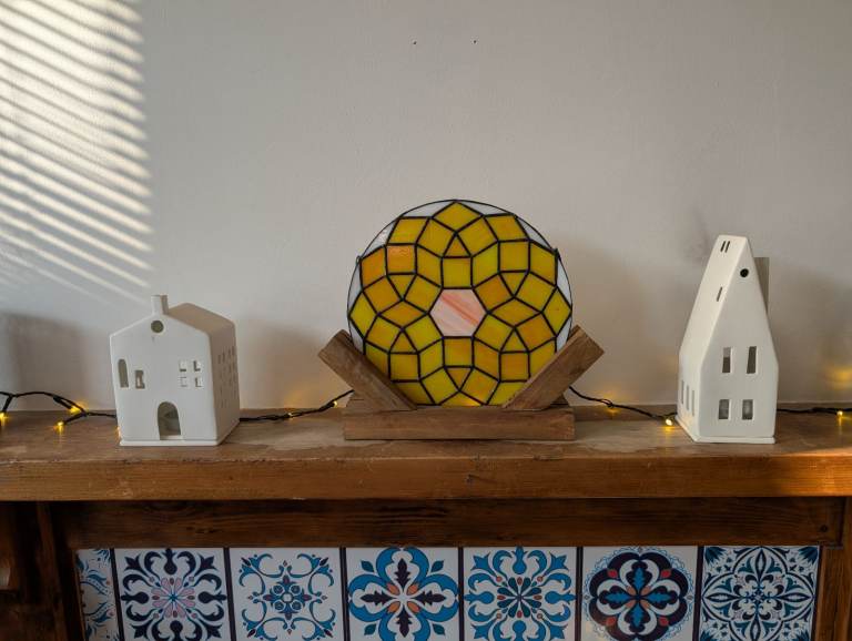 Real coloured glass pieces cut, shaped and soldered by hand.