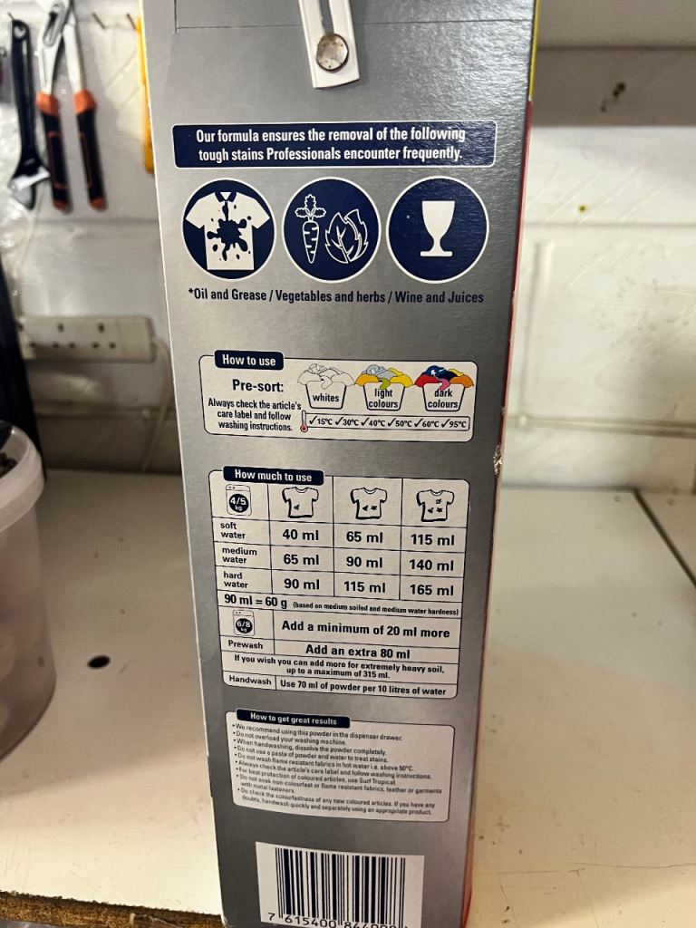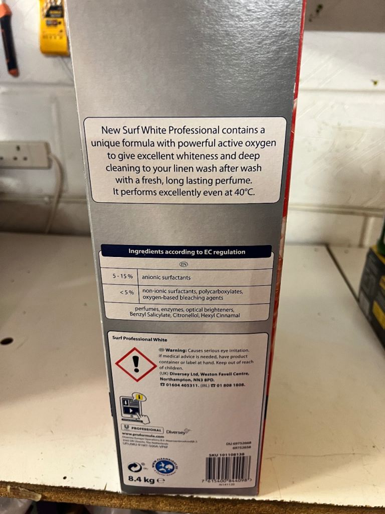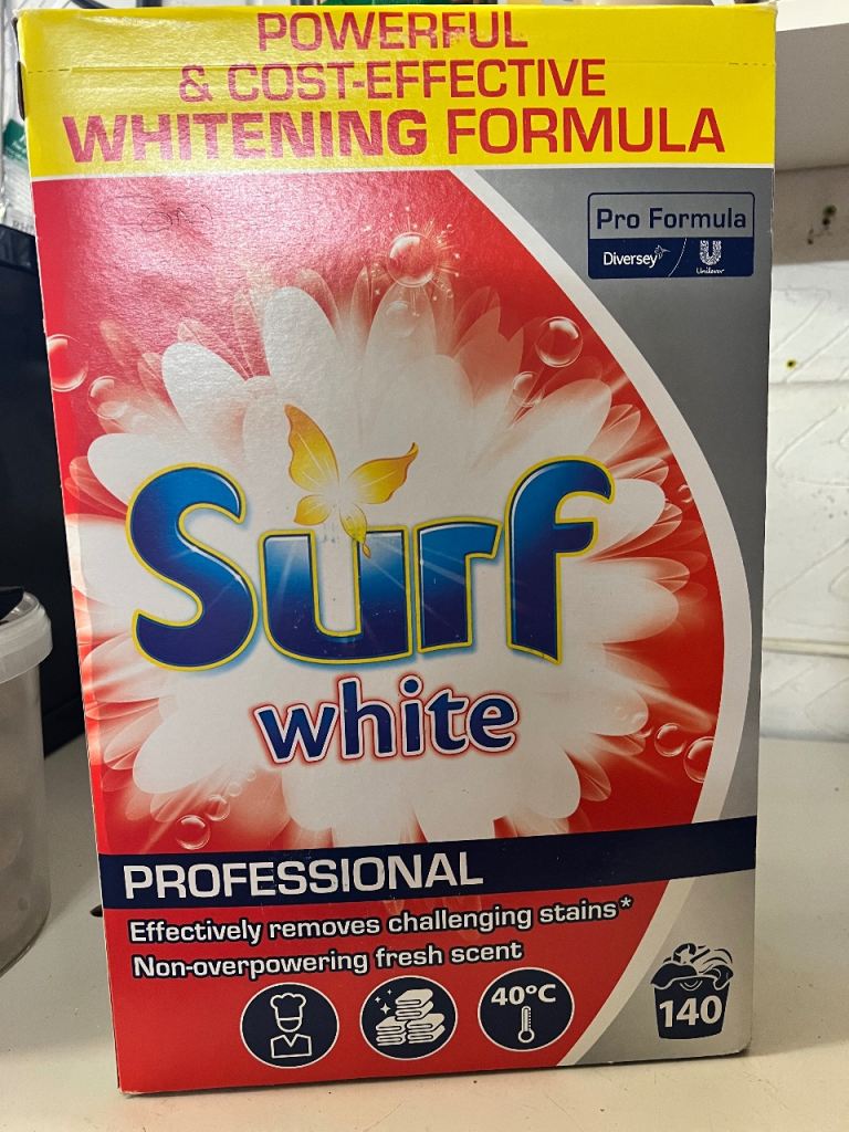 Surf Professional Washing Powder White 140 Washes 8.45kg: Surf Professional Washing Powder in White is a large pack suitable for 140 washes, making it ideal for professional use. The weight is 8.45 kg. Achieve professional-grade whitening for your whites with Surf Professional Washing Powder White 8.45kg. This powerful formula tackles tough stains and keeps your whites looking brighter for longer, even at lower wash temperatures. Surf Professional boasts a unique biological action with enzymes for exceptional stain removal, making it ideal for both homes and commercial laundries.