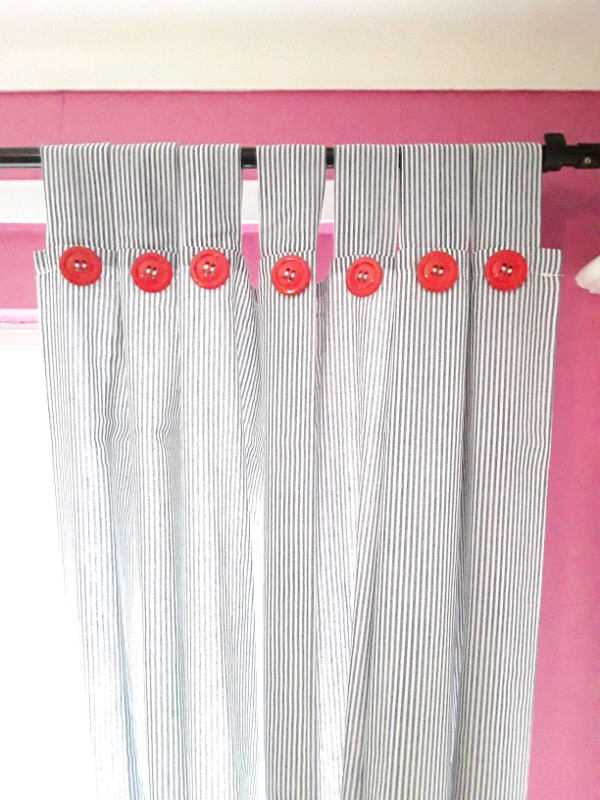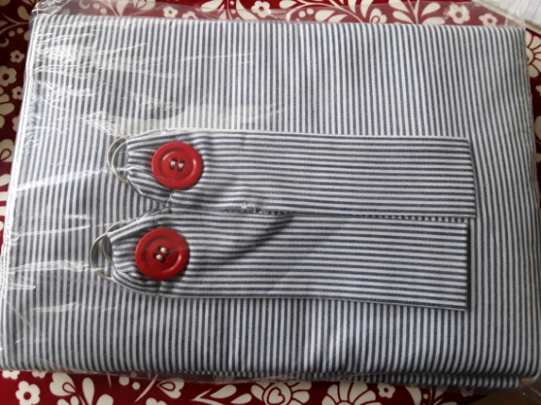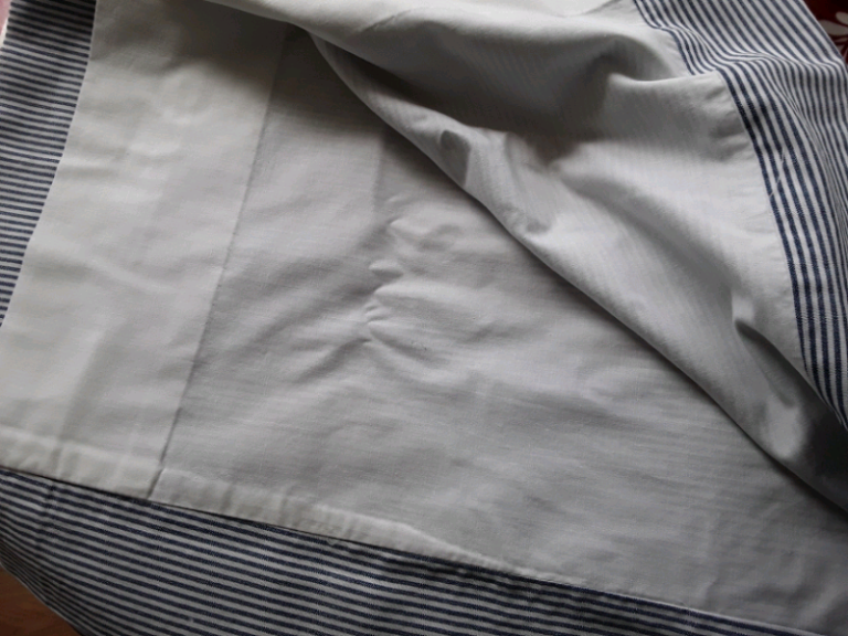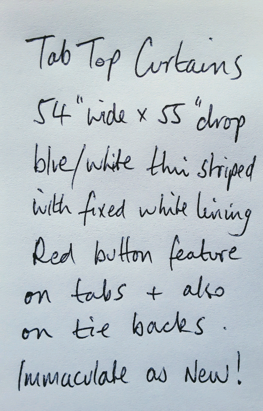 Tab Top Curtains 54 inch wide x 55 inch drop blue/white thin stripe red button