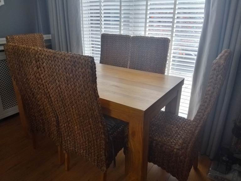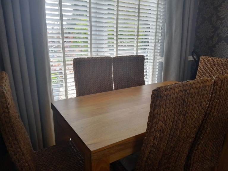 Excellent condition large table and 6 chairs-Purchased from Oak Furniture Land, beautiful wooden table, matching beautiful chairs. Would look very pleasing in most dining rooms.