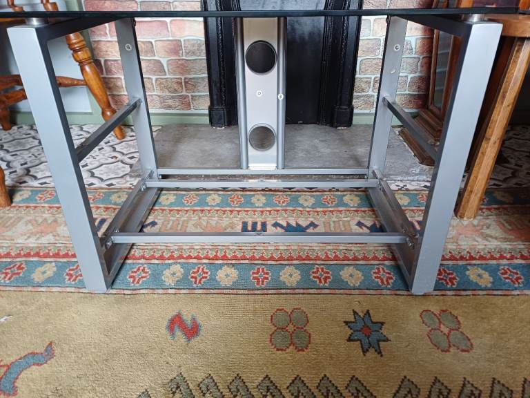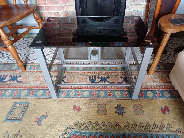 Television table in metal and toughand glass.in good condition 70cm long black glass top9