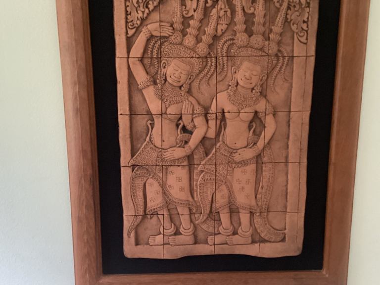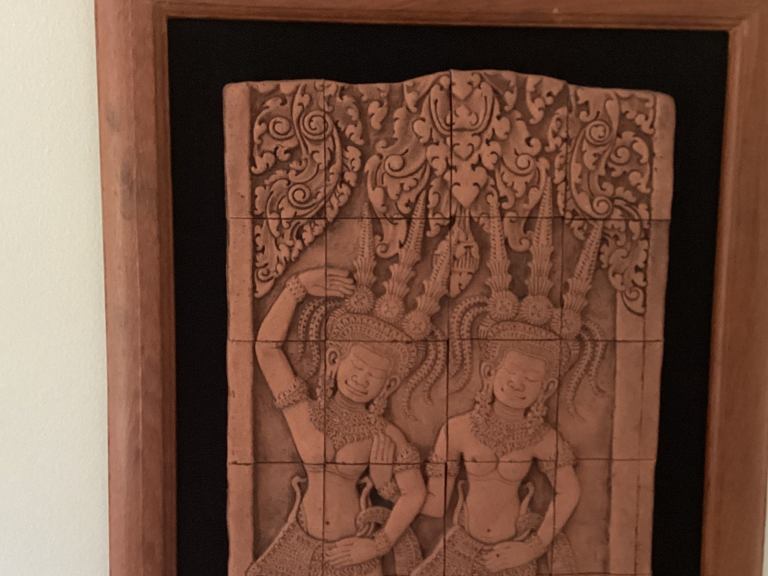 Beautiful framed Terracotta tiles of Thai dancers made up of 24 small pieces.